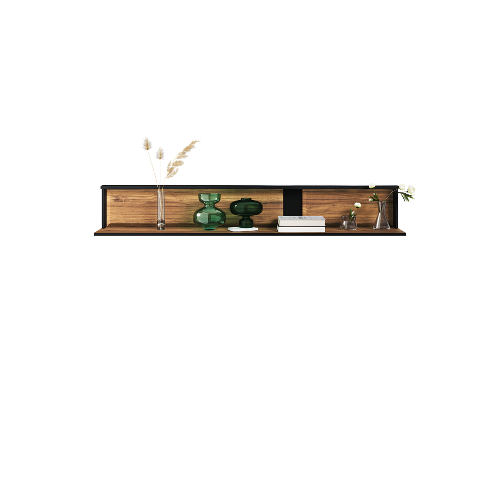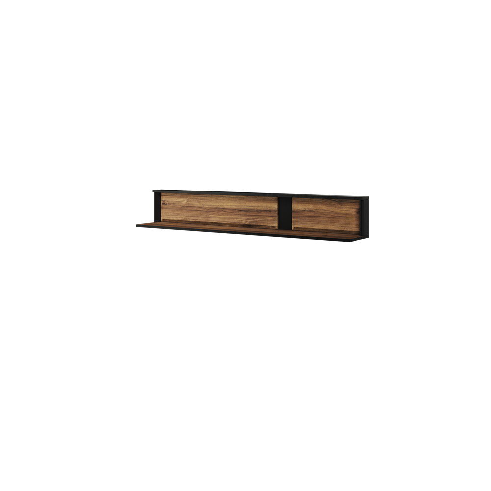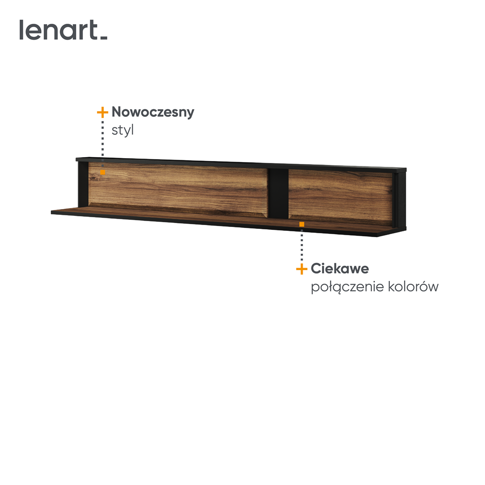 Praktyczna półka wisząca w nowoczesnym stylu. Ciekawe połączenie czerni i dekoru w kolorze ciemnego drewna prezentuje się elegancko i przytulnie. Szafka pozwala wykorzystać powierzchnię ścian do przechowywania. Możesz na niej umieścić książki lub ulubione dekoracje – obrazy, kwiaty czy porcelanę. Szafka świetnie wygląda zawieszona nad innymi meblami z kolekcji Borga, np. komodą lub szafką RTV. |