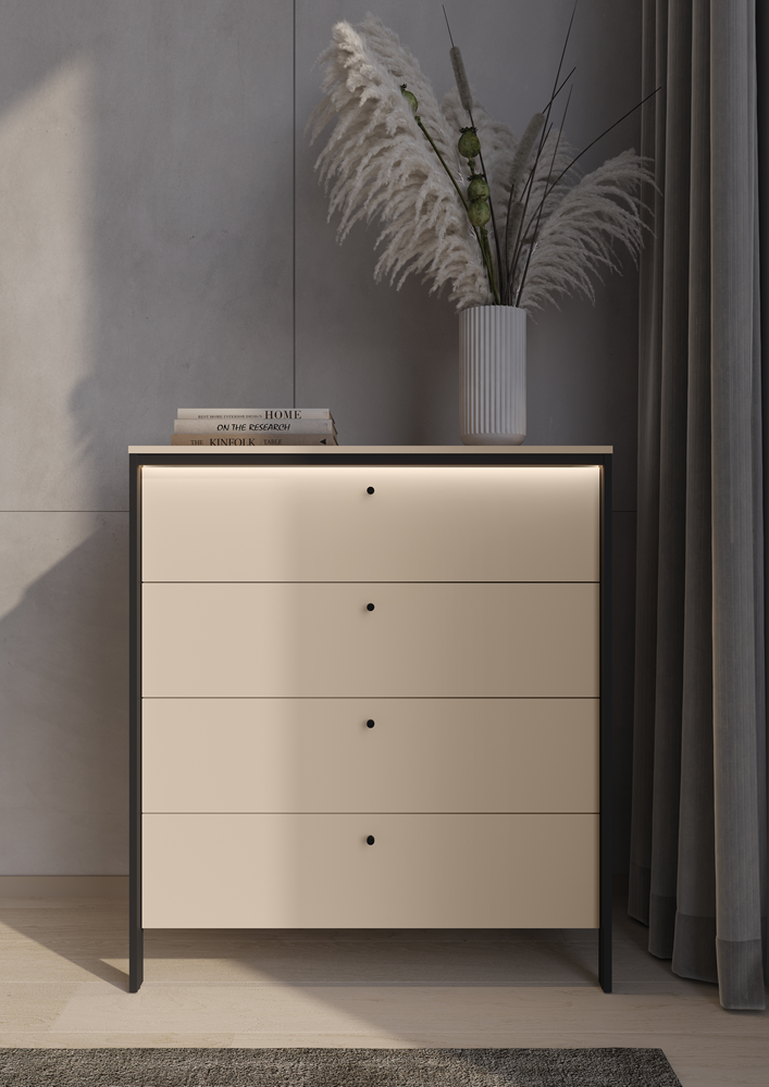 | Komoda z czterema pojemnymi szufladami, stanowiąca element kolekcji ENNA. Zaprojektowana jako część wyposażenia sypialni. Zapewnia dodatkowe miejsce do przechowywaniu ubrań i akcesoriów. Atutem produktu jest podświetlenie LED. Komoda z szufladami do sypialni, łączy w sobie funkcjonalność i elegancję. To mebel, który nie tylko spełnia swoją rolę jako miejsce do przechowywanie ubrań i pościeli, ale także podkreśla również wyjątkowy charakter wnętrza, w którym został umieszczony. Komoda z kolekcji ENNA zapewnia sporo miejsca do gromadzenia i segregowania rzeczy, które na co dzień znajdują się w naszej sypialni. Pozwala łatwo uporządkować przestrzeń w miejscu naszego odpoczynku. Solidna konstrukcja i starannie dobrane materiały to kolejne zalety naszego produktu. Komoda z szufladami do sypialni to rozwiązanie, które ułatwia organizację przestrzeni i nadaje sypialni wyjątkowego uroku. |