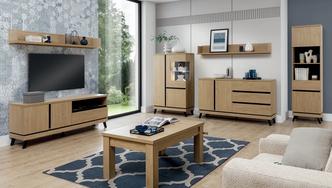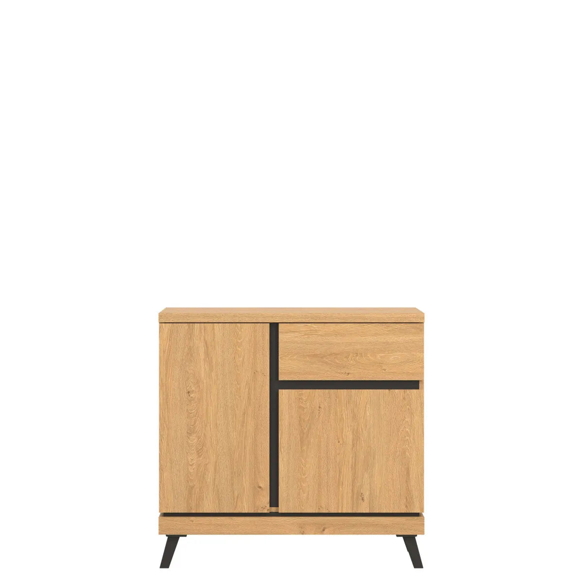 Kolor mebla, dąb kamienny z czarnymi wstawkami, nadaje komodzie wyjątkowego uroku. Czarne nóżki z trwałego tworzywa dodają stabilności oraz kontrastu całości.