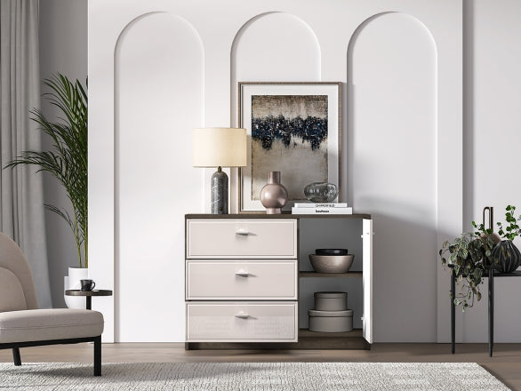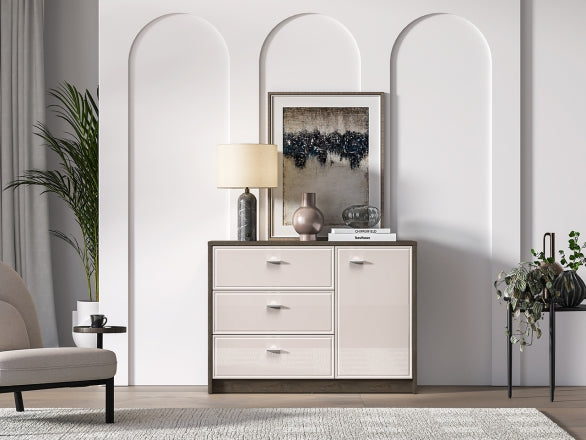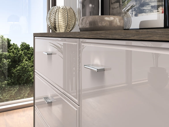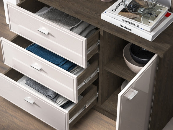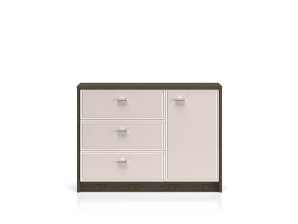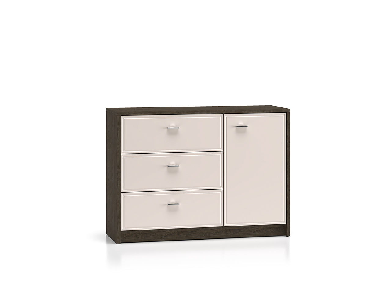 Komoda Avante łączy prostą, geometryczną formę z praktycznym układem przechowywania. Trzy szuflady po lewej stronie i zamykana szafka po prawej pozwalają wygodnie posegregować drobne przedmioty, dokumenty czy tekstylia oraz większe rzeczy, które warto mieć pod ręką, ale poza zasięgiem wzroku. Gładkie fronty i proste uchwyty zapewniają wygodne, codzienne użytkowanie w salonie, sypialni czy przedpokoju.