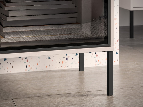 Komoda została wykonana z trwałej płyty meblowej z elementami szklanymi, co zapewnia stabilność i estetyczny wygląd przez długi czas. Waga 58,5 kg świadczy o solidnej konstrukcji. Mebel osadzony jest na nóżkach, które nadają bryle lekkości i ułatwiają utrzymanie czystości pod komodą. System cichego domyku zwiększa komfort codziennego użytkowania, zapewniając płynne i bezgłośne zamykanie.