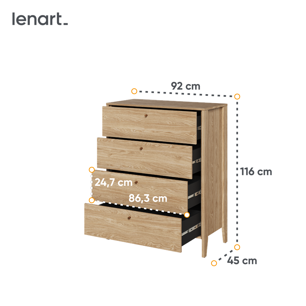 Mała komoda do sypialni z linii COZY – funkcjonalność i styl w jednym. To praktyczne rozwiązanie zaprojektowane z myślą o ograniczonych przestrzeniach, optymalne nawet dla niewielkich pomieszczeń. Jej kompaktowe wymiary umożliwiają łatwe umieszczenie w mniejszych wnętrzach, a cztery pojemne szuflady dostarczają dużo miejsca do przechowywania. Na górze znajduje się praktyczny blat, idealny do postawienia lampki nocnej, zdjęć czy innych dekoracji.