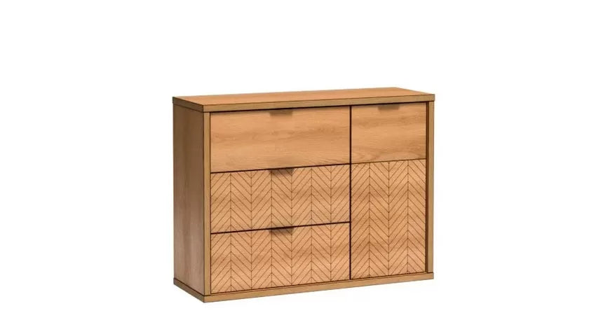 Komoda z kolekcji FONTI jest nie tylko funkcjonalna, ale także doskonale sprawdzi się, mimo swoich mniejszych rozmiarów, jako praktyczne rozwiązanie do przechowywania. Mebel wykonany jest w kolorze dąb karmel, który nadaje mu naturalny i ciepły wygląd.