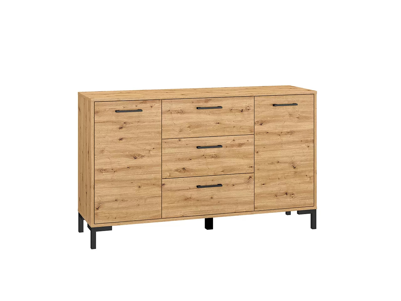 Komoda Nevio ma kolor dąb artisan, który nadaje jej naturalny i ciepły wygląd. Ten odcień drewna dodaje elegancji i harmonijnie wpisuje się w różne style aranżacyjne. Nogi komody są w kolorze czarnym, co dodaje kontrastu i nowoczesności, podkreślając jednocześnie jej designerski wygląd.