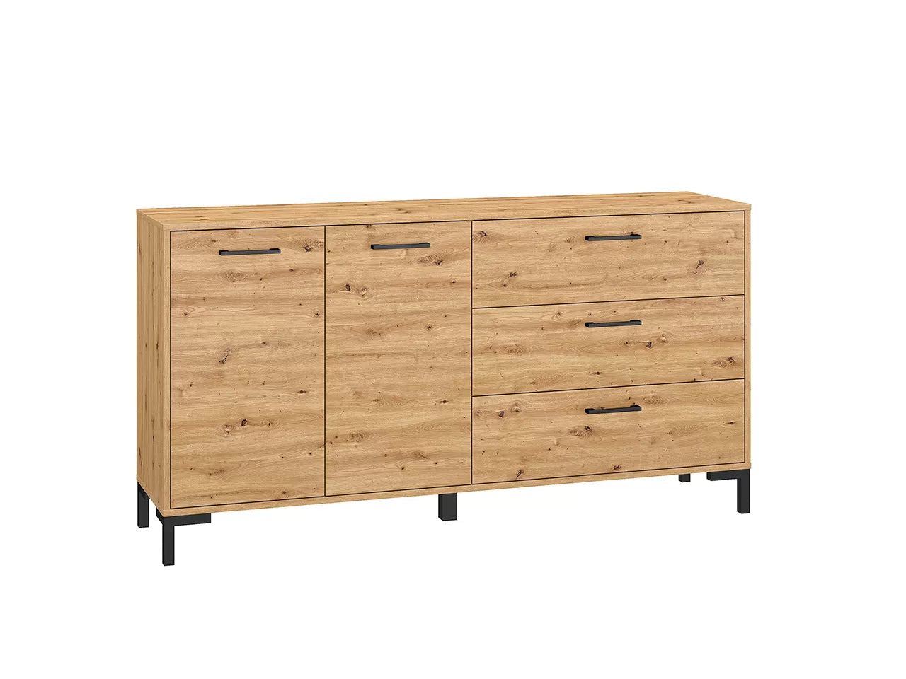 Komoda Nevio ma kolor dąb artisan, który nadaje jej naturalny i ciepły wygląd. Ten odcień drewna dodaje elegancji i harmonijnie wpisuje się w różne style aranżacyjne. Nogi komody są w kolorze czarnym, co dodaje kontrastu i nowoczesności, podkreślając jednocześnie jej designerski wygląd.