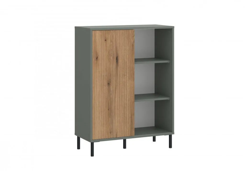 Komoda jednodrzwiowa Pozzi to stylowy, funkcjonalny mebel, który doskonale łączy estetykę z wygodą użytkowania. Choć zajmuje niewiele miejsca, jej pojemne półki, ukryte częściowo za przesuwnym, ryflowanym frontem, oferują sporo przestrzeni do przechowywania, co czyni ją idealnym rozwiązaniem do salonu, jadalni czy pokoju młodzieżowego. Wykonana z laminowanej płyty wiórowej (korpus) oraz MDF (front), komoda wyróżnia się solidną konstrukcją, osadzoną na wysokich, smukłych metalowych nóżkach, które dodają jej lekkości i nowoczesnego charakteru.