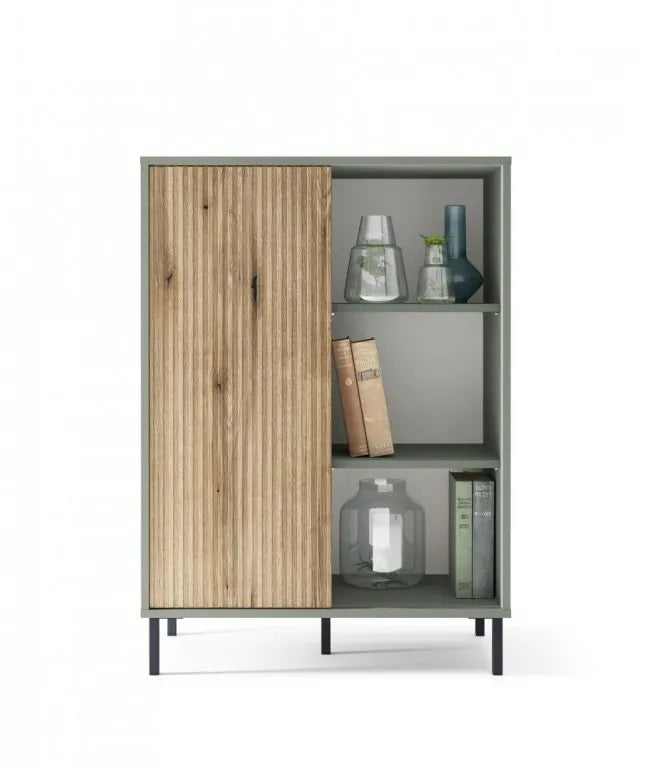 Połączenie szarozielonego odcienia korpusu z drewnianym wybarwieniem Dąb Coast Evoke oraz ryflowanym frontem nadaje meblowi luksusowy wygląd i elegancki styl. Bezuchwytowy design o prostych, minimalistycznych kształtach sprawia, że komoda świetnie pasuje zarówno do dużych, jak i małych wnętrz. Idealnie komponuje się w aranżacjach eklektycznych, vintage i boho, ale sprawdzi się także w stylu loftowym, szczególnie w zestawieniu z surowymi elementami, takimi jak beton architektoniczny.