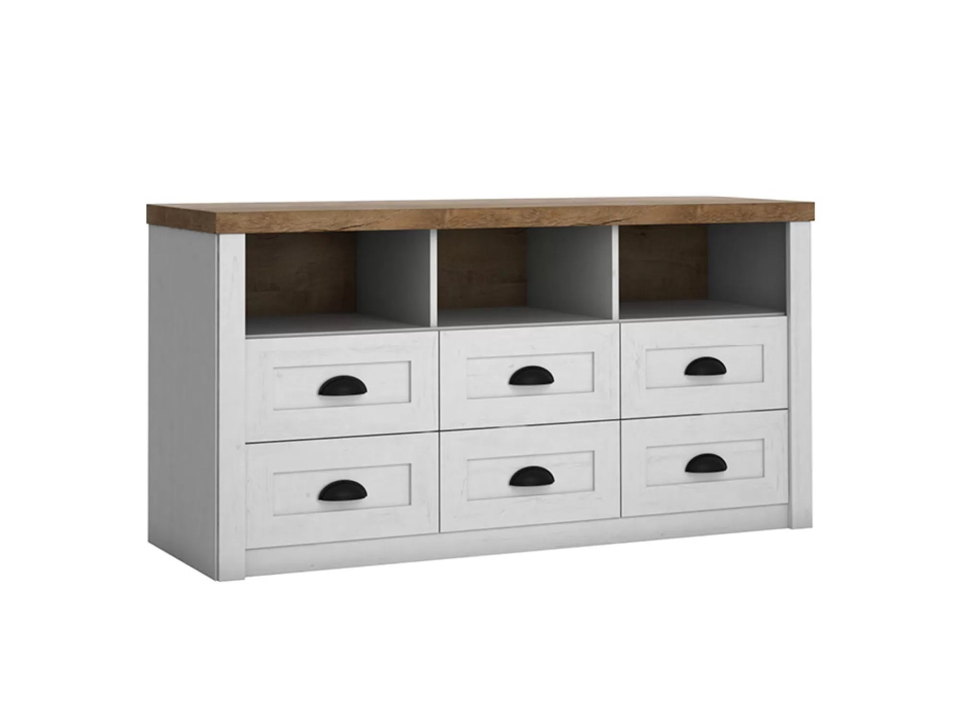 Komoda Prowansja jest wyposażona w 6 szuflad, które zapewniają dużo miejsca do przechowywania różnych przedmiotów. Szuflady są praktyczne, łatwe w użyciu i mają metalowe czarne uchwyty, które dodają meblowi nowoczesnego wyglądu.