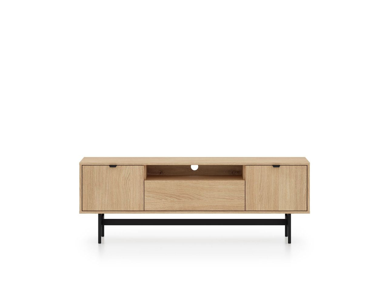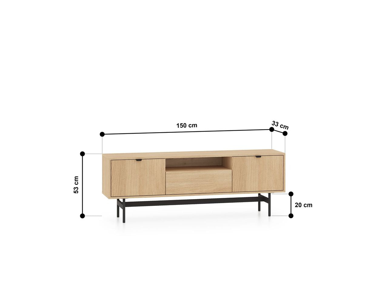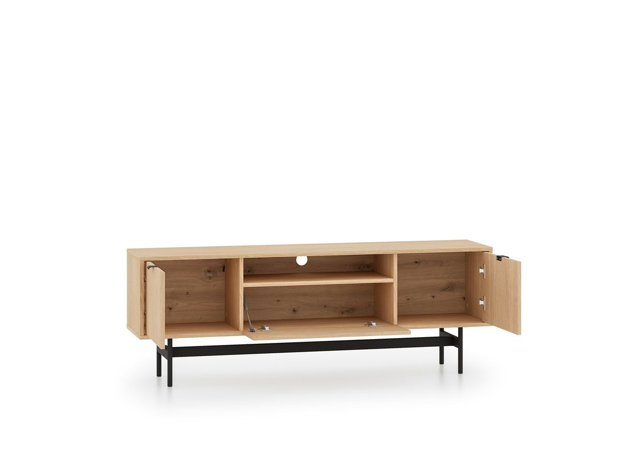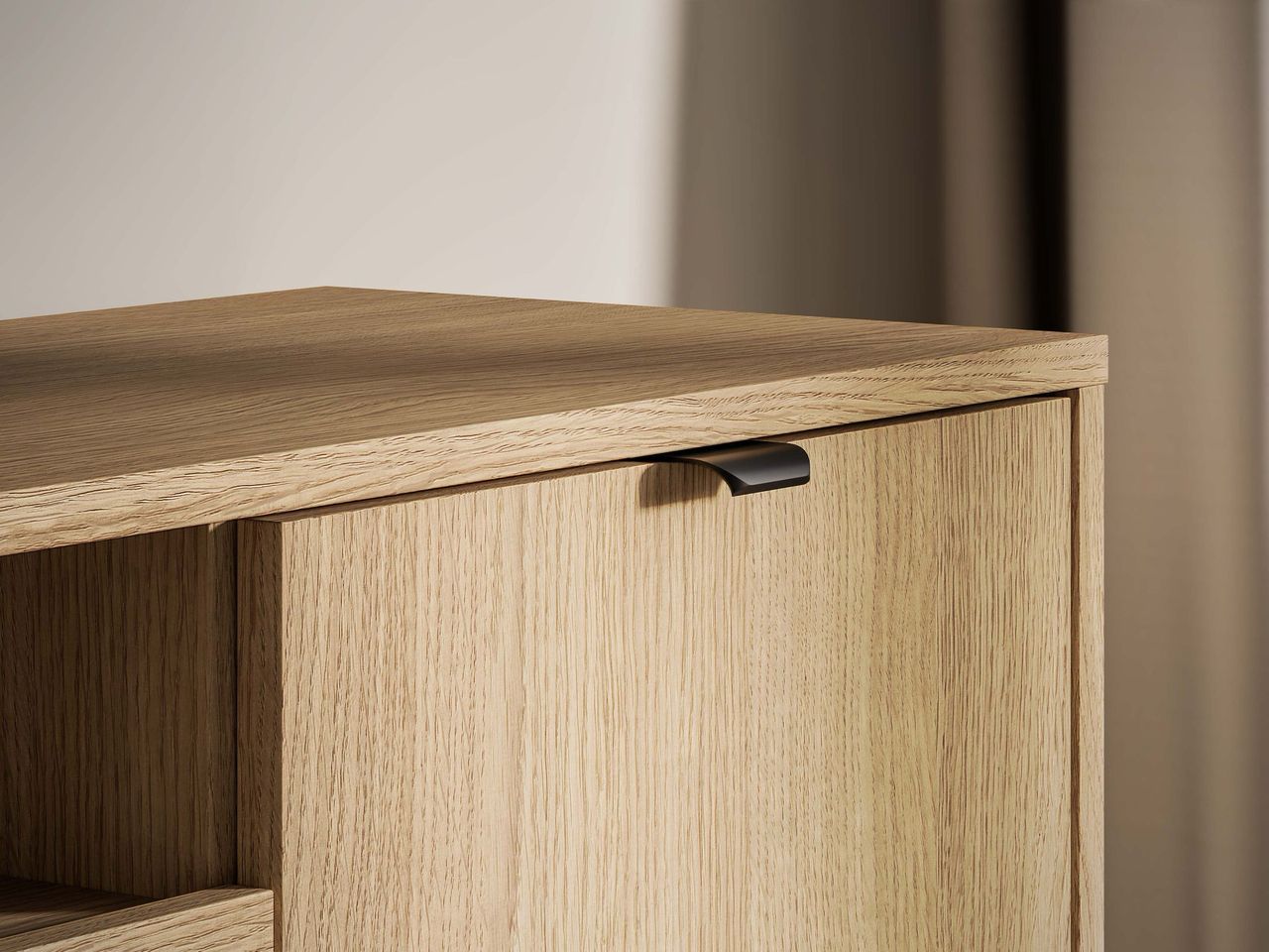 Naturalny dekor Dąb Mavelie w połączeniu z subtelną, metalową podstawą nadaje bryle elegancji i nowoczesnego charakteru. Przemyślana konstrukcja pozwala na wygodne przechowywanie akcesoriów multimedialnych, pilotów czy dokumentów, a minimalistyczny front podkreśla estetykę całego wnętrza.