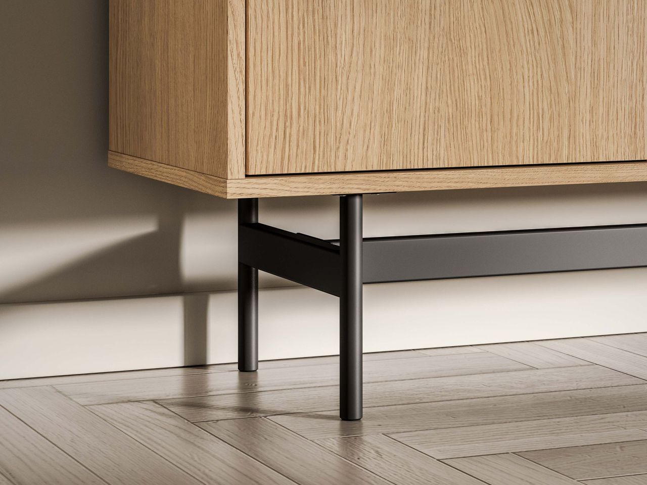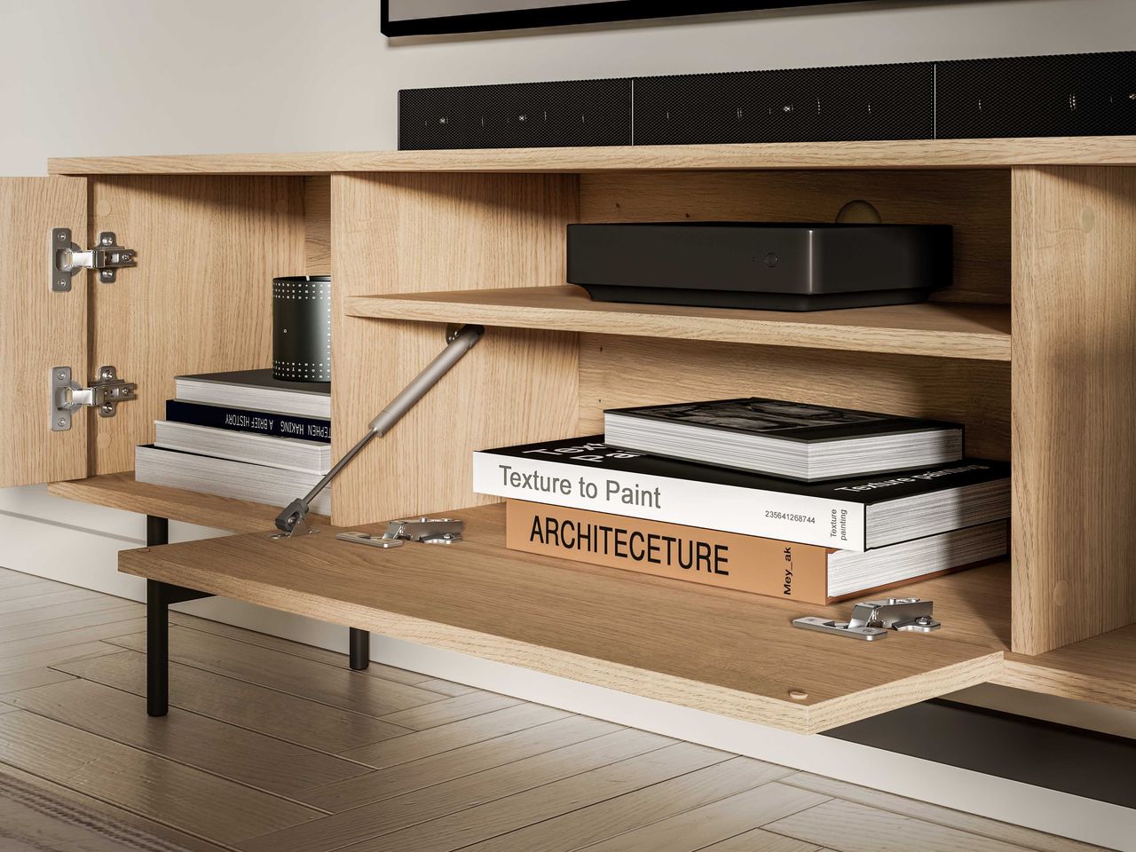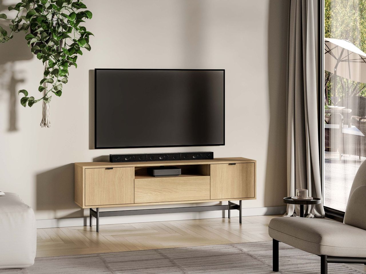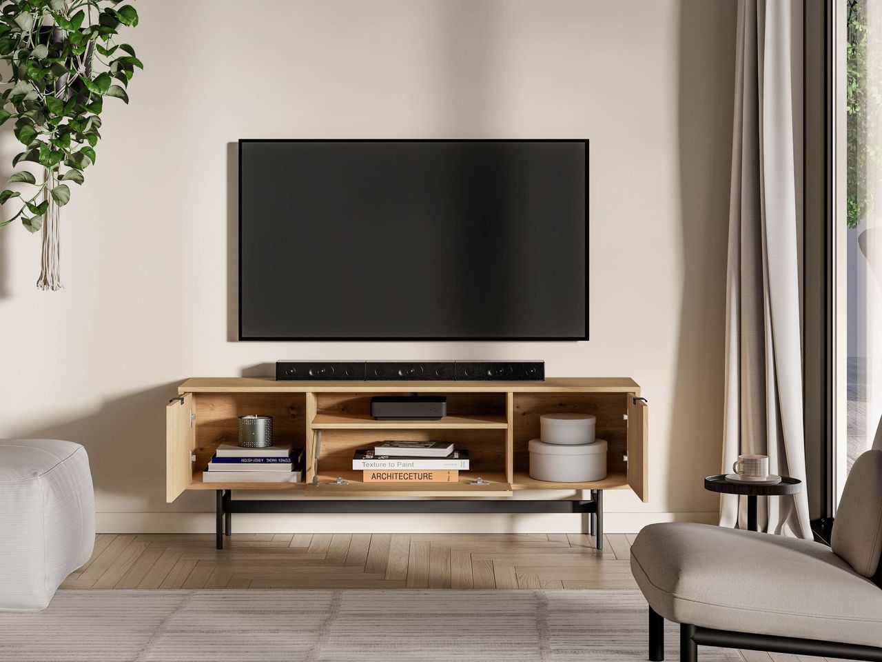 Naturalny dekor Dąb Mavelie w połączeniu z subtelną, metalową podstawą nadaje bryle elegancji i nowoczesnego charakteru. Przemyślana konstrukcja pozwala na wygodne przechowywanie akcesoriów multimedialnych, pilotów czy dokumentów, a minimalistyczny front podkreśla estetykę całego wnętrza.