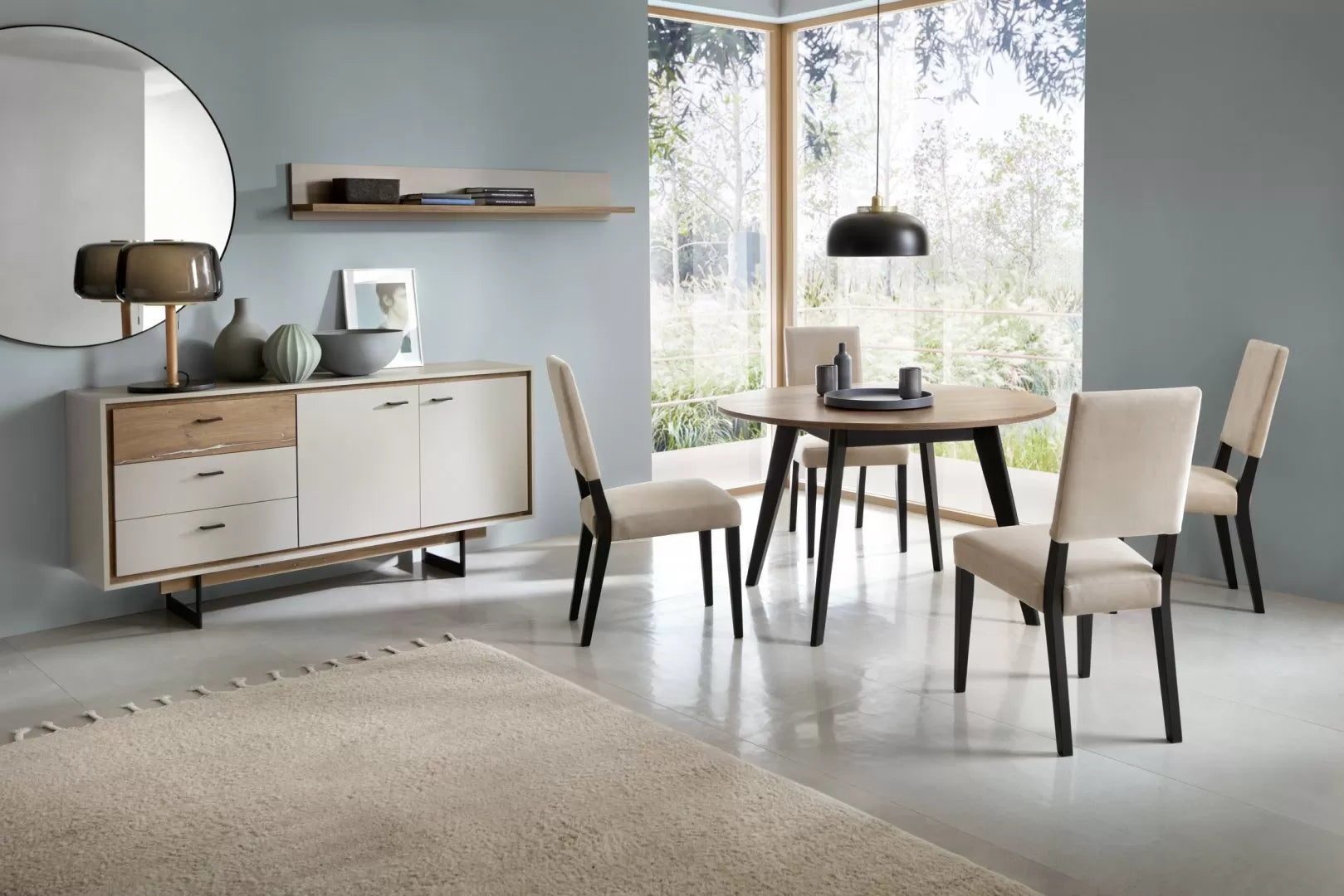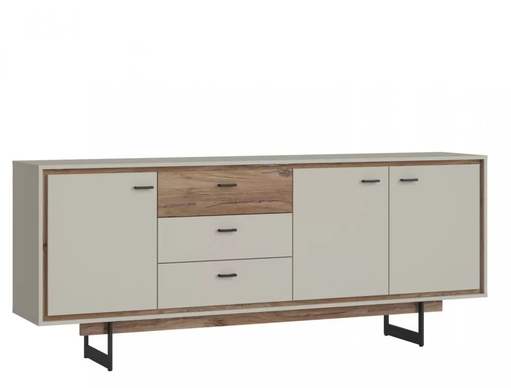 Komoda Rivero posiada metalowe czarne nogi, które zapewniają stabilność i solidne podparcie. Te wytrzymałe nogi dodają również industrialnego akcentu do mebla, podkreślając jego nowoczesny charakter.