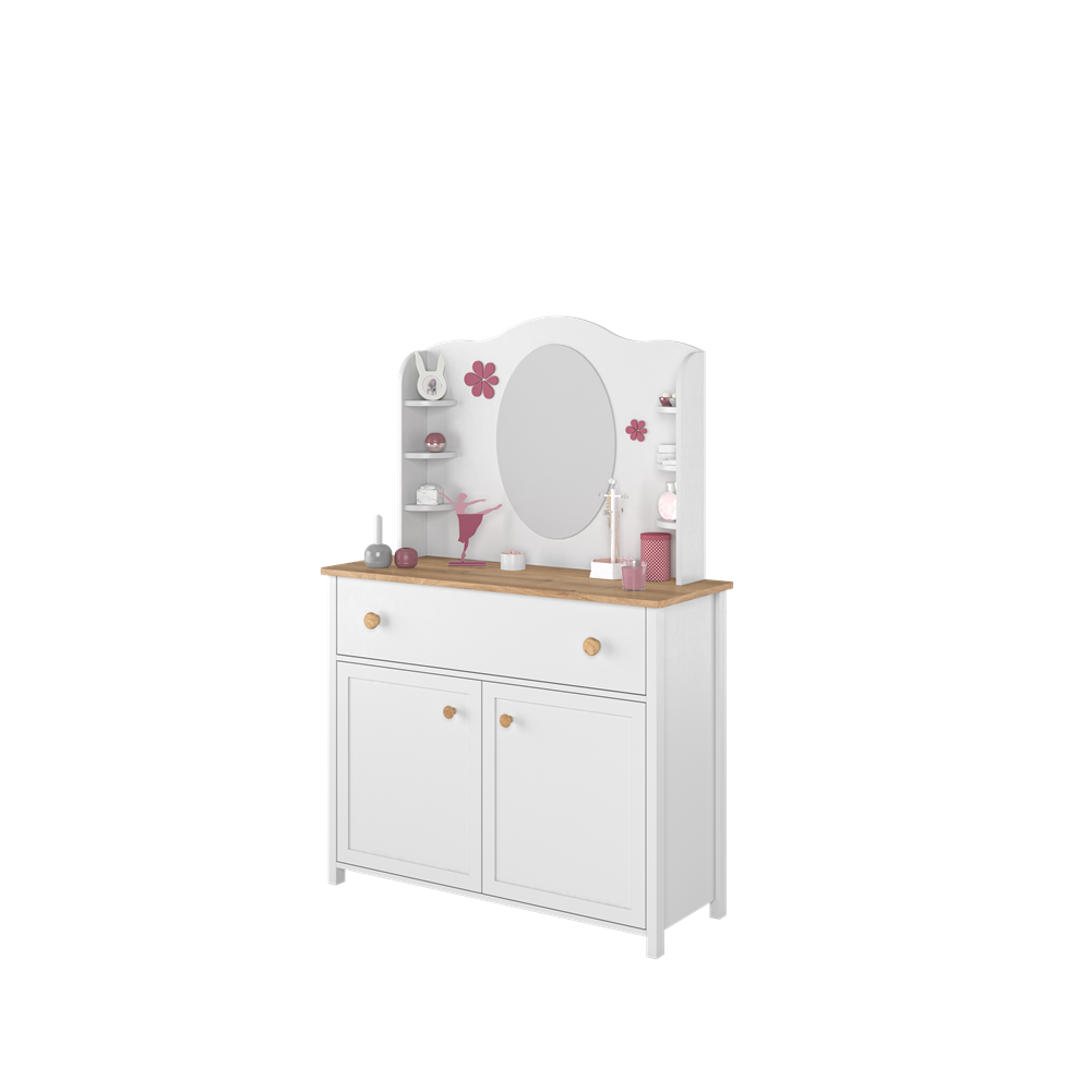 Jej biała bryła wykonana jest z wysokiej jakości płyty meblowej, co gwarantuje trwałość i stabilność konstrukcji. Kolor biały nadaje meblowi świeży, czysty wygląd, który doskonale wpisuje się w różnorodne aranżacje wnętrz.