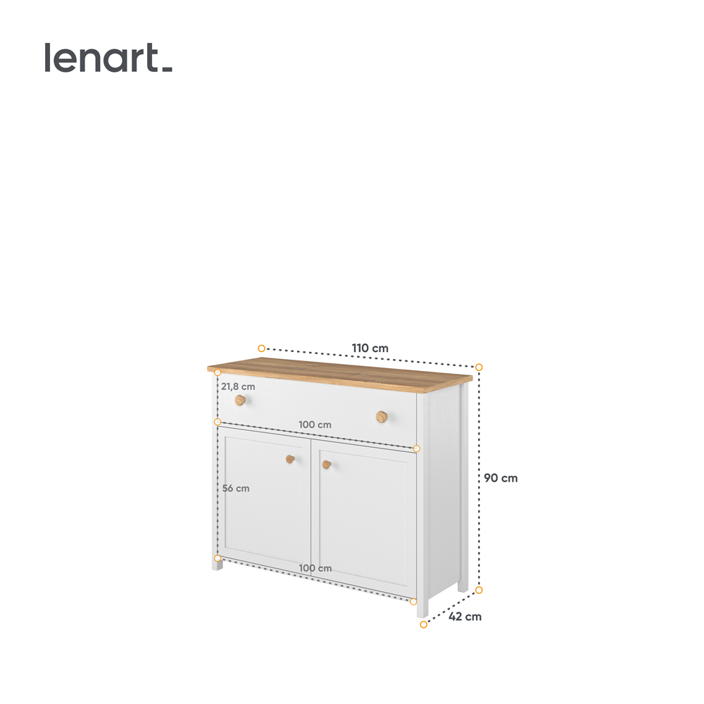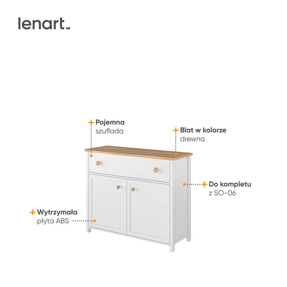 Detale w kolorze dąb nash, które zdobią mebel, nadają mu wyjątkowego charakteru. To subtelny, naturalny akcent, który harmonijnie współgra z białą bryłą, tworząc spójną i estetyczną kompozycję.