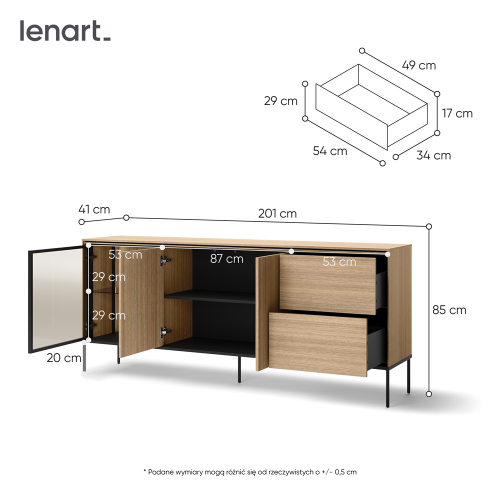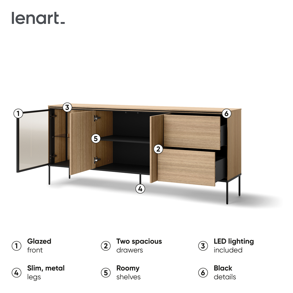 Komoda została zaprojektowana z myślą o współczesnych trendach wnętrzarskich. Jej minimalistyczna, a zarazem elegancka forma doskonale komponuje się z aranżacjami w stylu nowoczesnym, skandynawskim, loftowym czy klasycznym. Starannie dobrane materiały i stylowe wykończenie sprawiają, że mebel ten wyróżnia się estetyką i ponadczasowym charakterem.