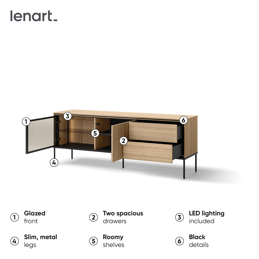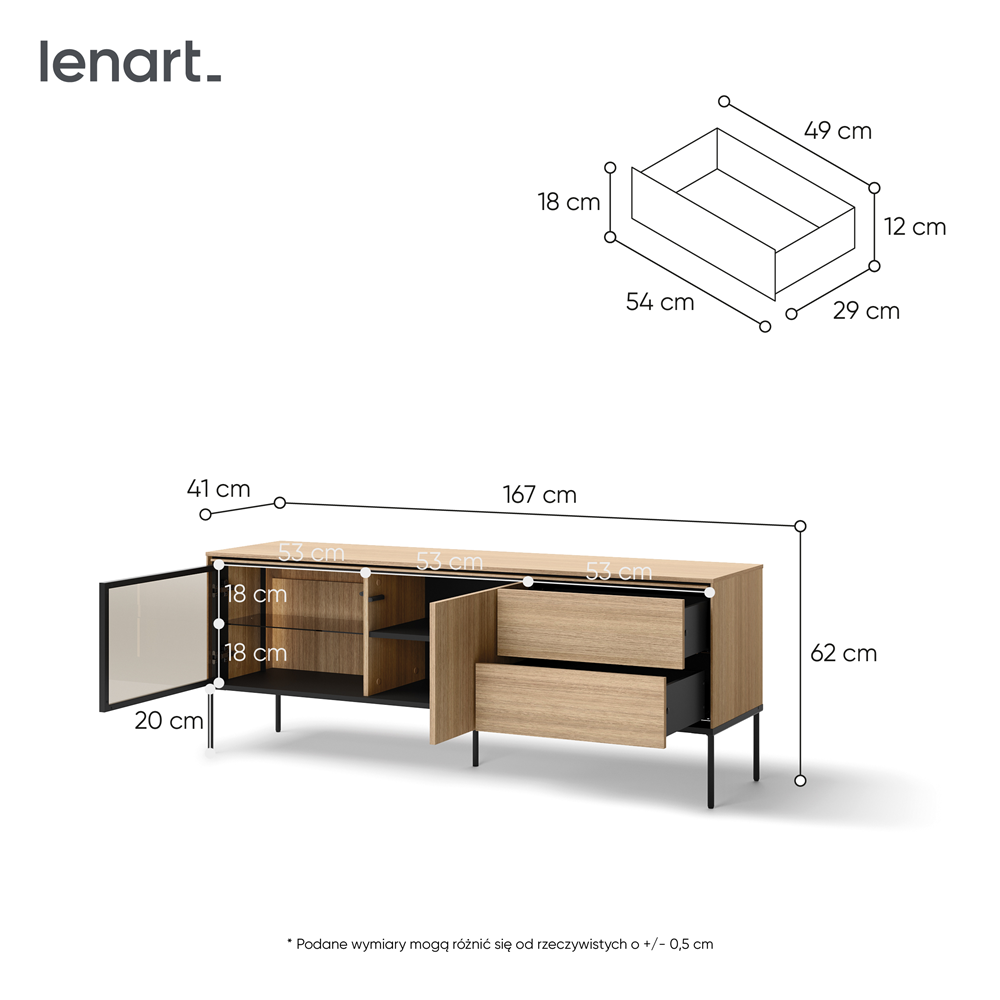 Zadbaj o nowoczesny wygląd swojego salonu, wybierając komodę RTV, która łączy w sobie elegancję, funkcjonalność i solidność. Komoda RTV to nie tylko praktyczny mebel, ale także kluczowy element dekoracyjny w salonie. Nasze komody charakteryzują się nowoczesnym designem, który doskonale komponuje się z różnymi stylami aranżacyjnymi – od minimalistycznych, przez industrialne, po klasyczne Została zaprojektowana z myślą o Twojej wygodzie. Posiada przestronne półki i szuflady, które pomieszczą cały sprzęt multimedialny – telewizor, odtwarzacz, konsole, a także kable, piloty i inne akcesoria. Wykonana z wysokiej jakości materiałów, komoda cechuje się solidnością i wytrzymałością, co zapewnia stabilność i bezpieczeństwo dla Twojego sprzętu. |