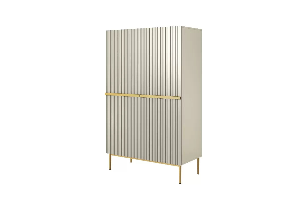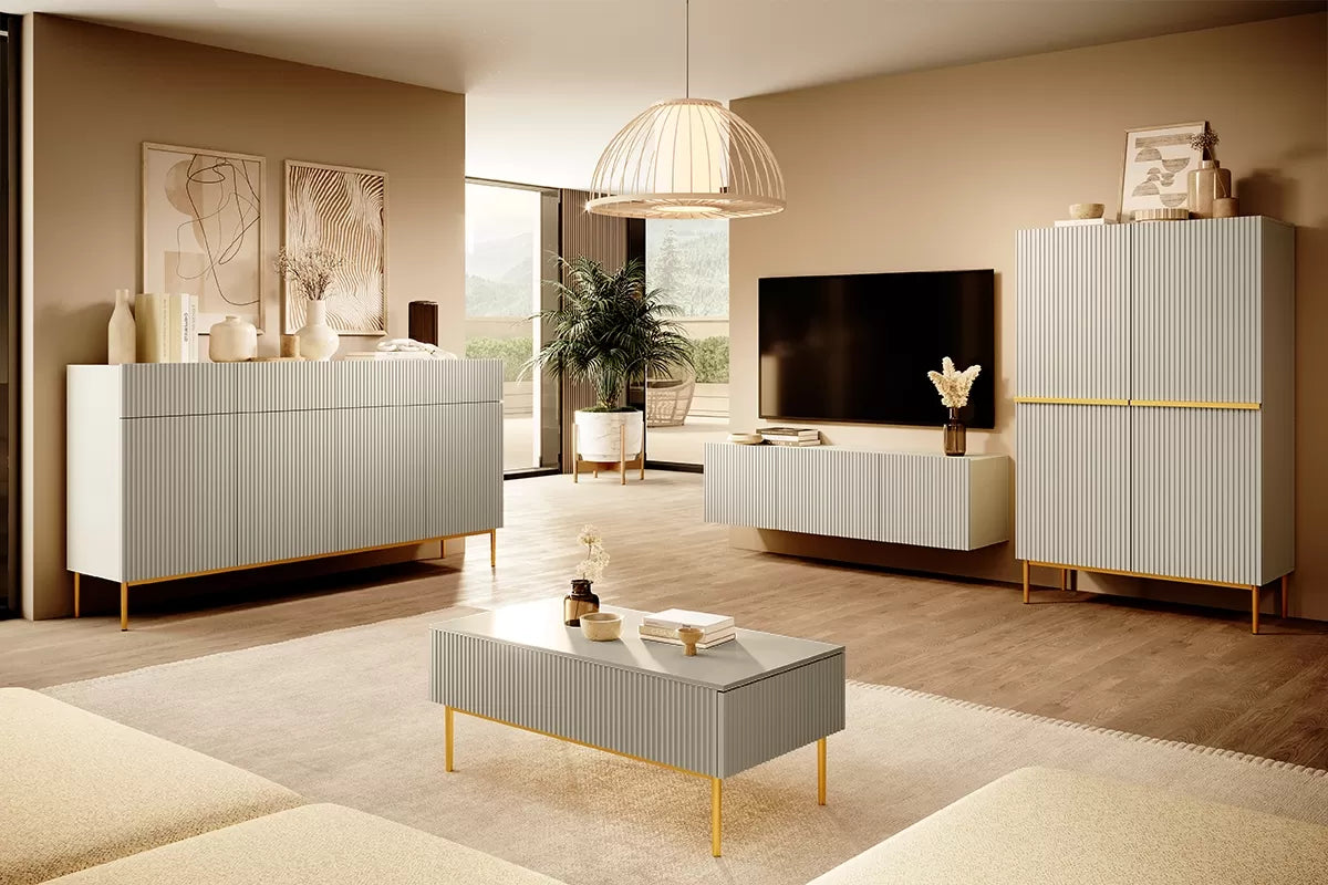 Front kredensu wykonany jest w modnym ryflowanym wzorze, co nadaje meblowi wyjątkowego charakteru. Ozdobna złota listwa na froncie to elegancki detal, który dodaje meblowi ekskluzywnego wyglądu.