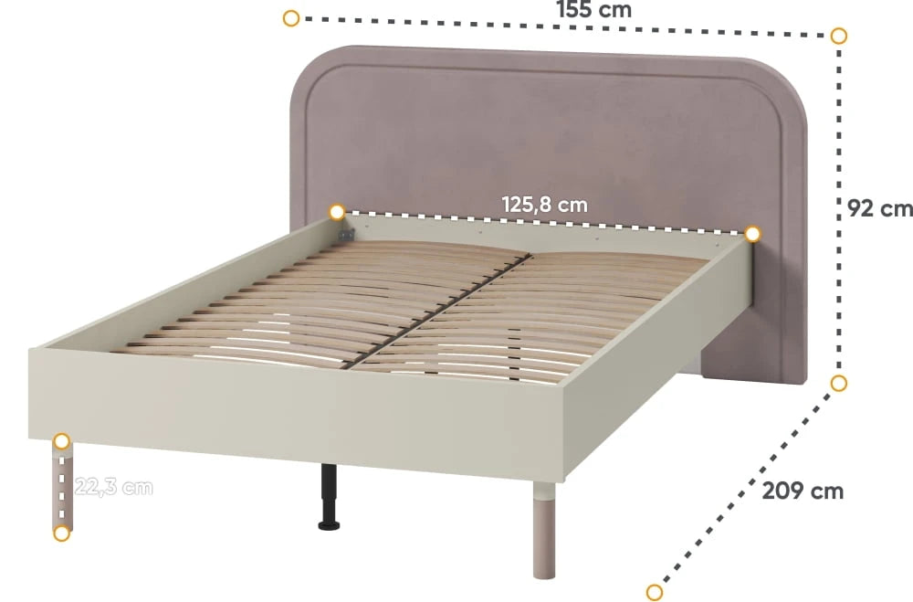 Nóżki łóżka wykonane są z metalu, które zachowują odcienie kaszmiru połączone z delikatnym truflowym akcentem. To nietypowe połączenie kolorów nadaje łóżku charakteru i tworzy harmonijną kompozycję, która jest zarówno elegancka, jak i stylowa.
