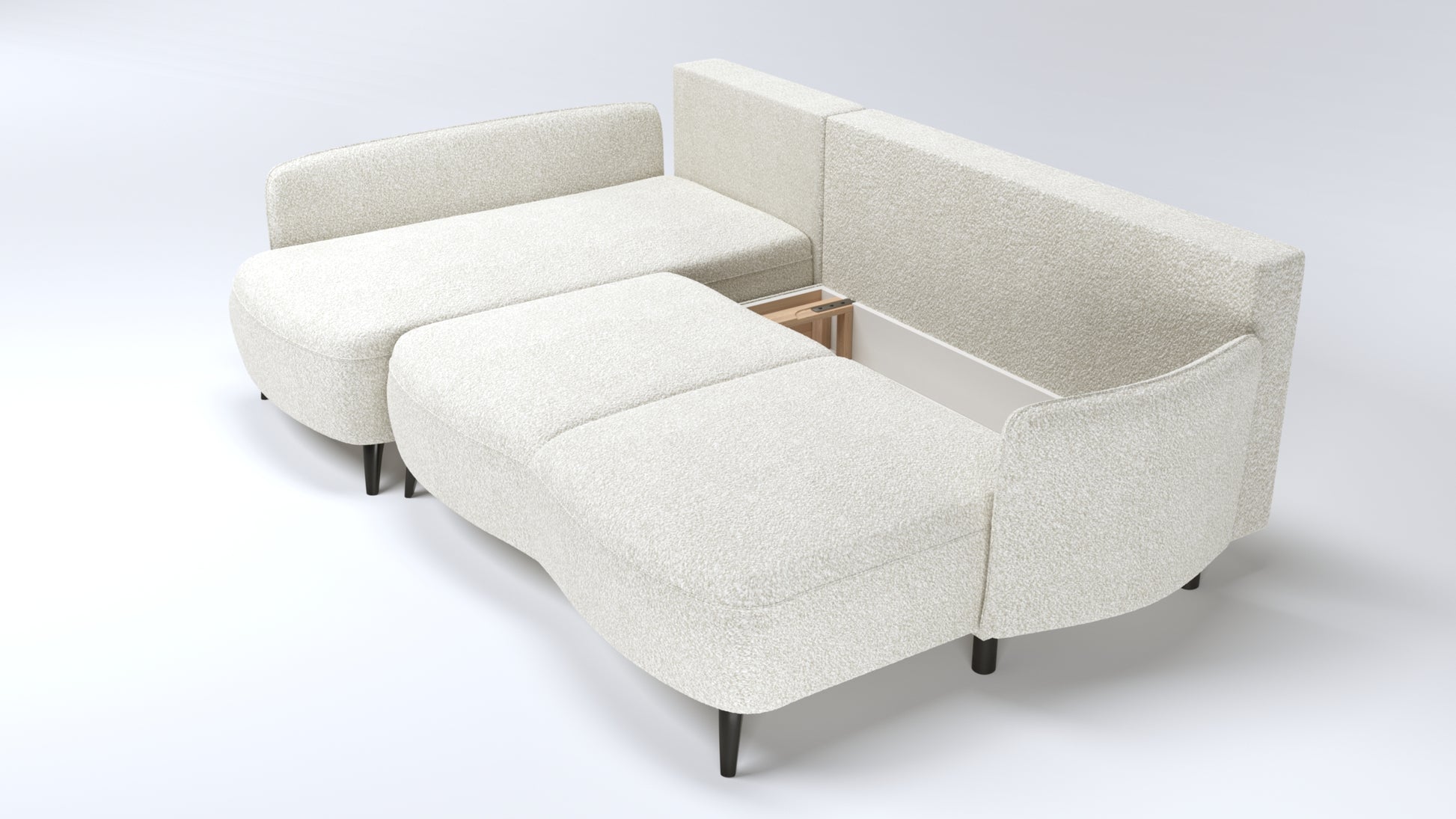 Model ten został wzbogacony o pojemny schowek na pościel, co pozwala na lepszą organizację przestrzeni. Ukryty wewnątrz konstrukcji pojemnik zapewnia łatwy dostęp do dodatkowych tekstyliów, a jednocześnie pomaga zachować porządek w salonie. Prześwit pod meblem wynoszący 12 cm ułatwia korzystanie z robotów sprzątających, co dodatkowo podnosi komfort użytkowania.