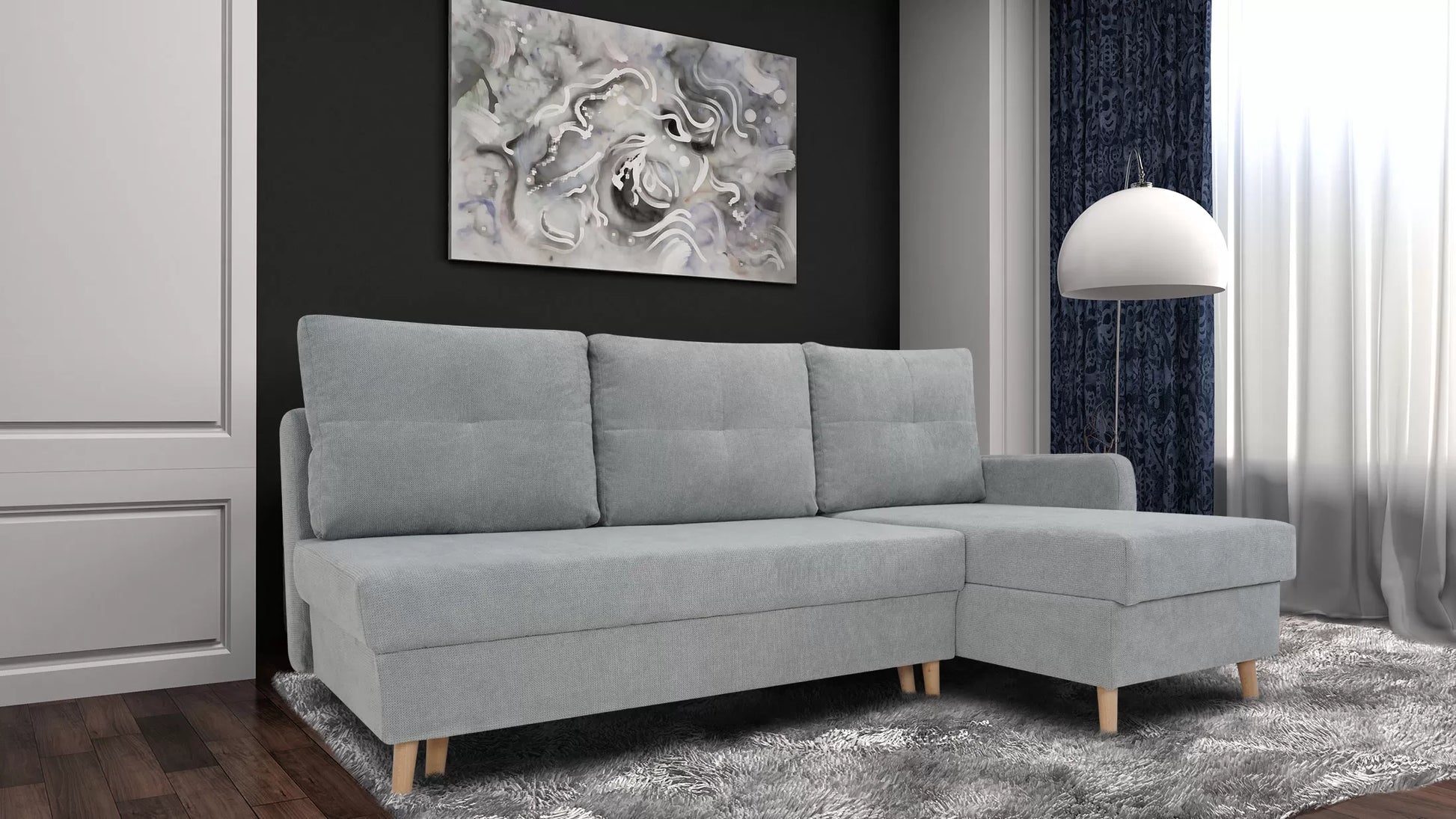 Narożnik Ethan to idealne rozwiązanie dla małych pomieszczeń, które oferuje wygodne miejsce do siedzenia oraz funkcję rozkładaną, umożliwiającą przekształcenie go w wygodne łóżko w razie potrzeby.