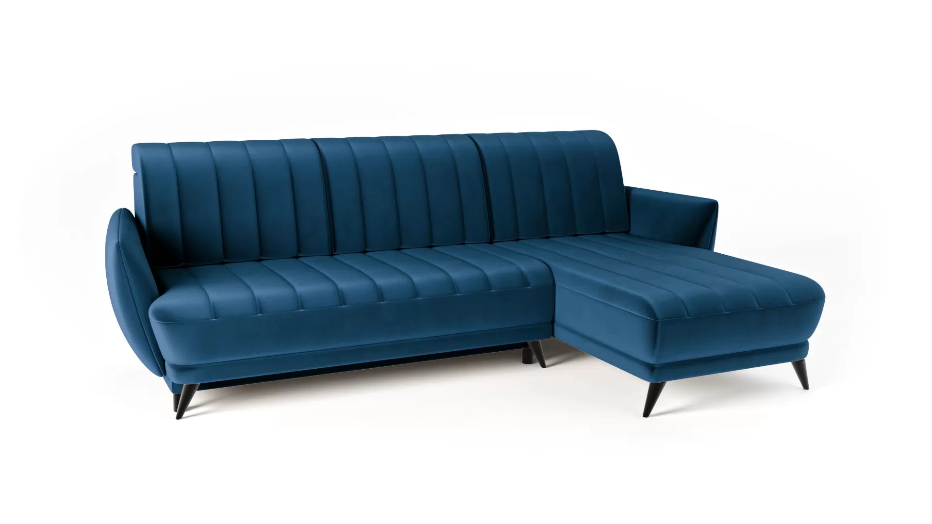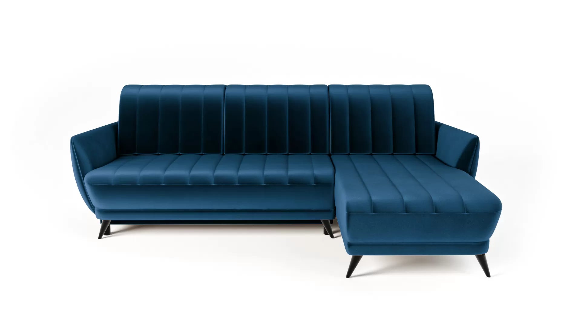 Narożnik Roy to elegancki mebel, który łączy styl i wygodę. Wykonany jest z tkaniny o nazwie bluvel, która jest rodzajem miękkiego velvetu, nadając mu miękkość i delikatność w dotyku. Pikowania pionowe na oparciu i siedzisku dodają narożnikowi Roy wyjątkowego charakteru.