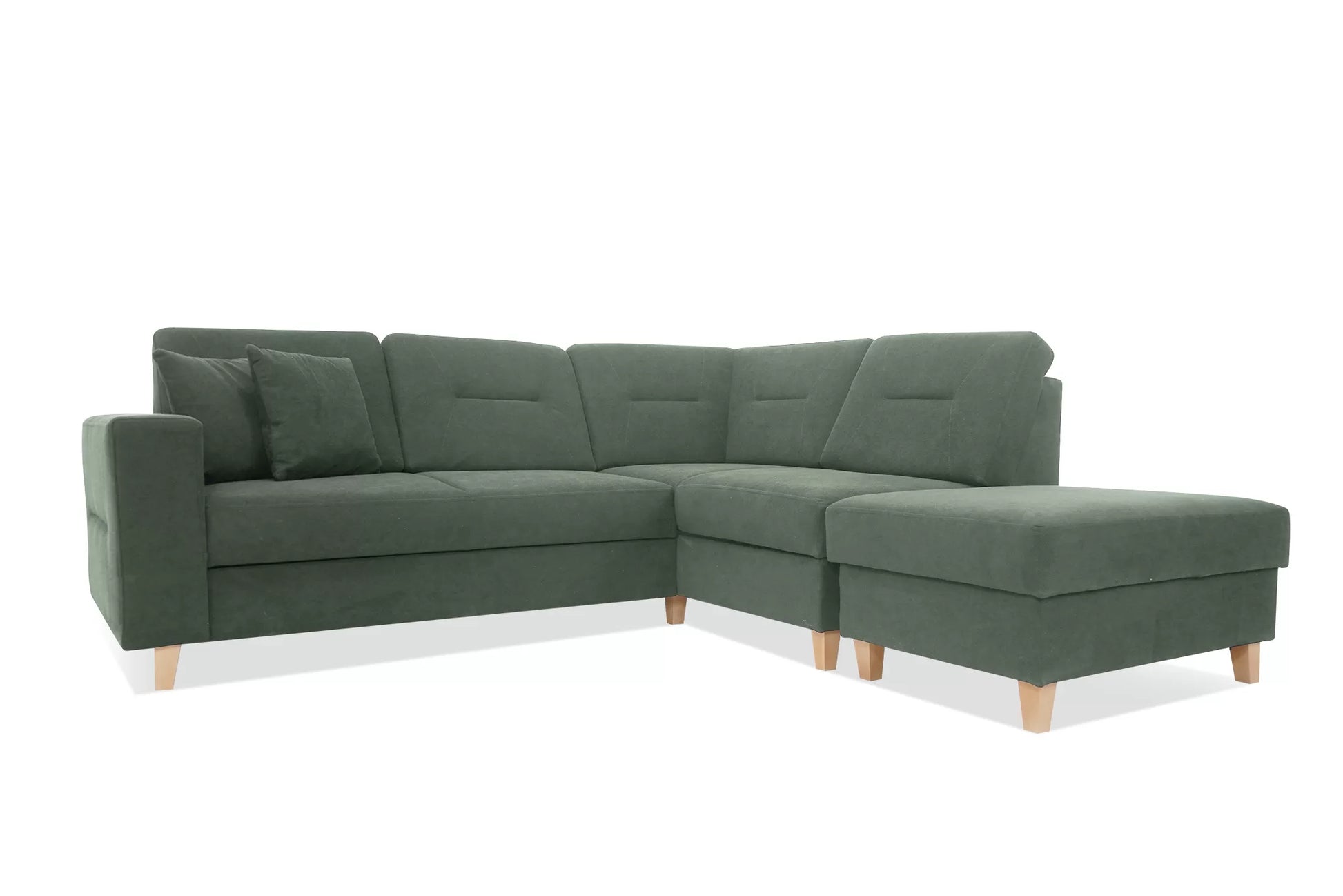 Tapicerka sofy jest wykonana z miękkiej tkaniny typu dzianina, która jest wytrzymała i przyjemna w dotyku, pokryta powłoką hydrofobową. Kolor oliwkowy nadaje sofie eleganckiego wyglądu, który pasuje do wielu różnych aranżacji wnętrz. Narożnik dostępny jest również w innej kolorystyce.