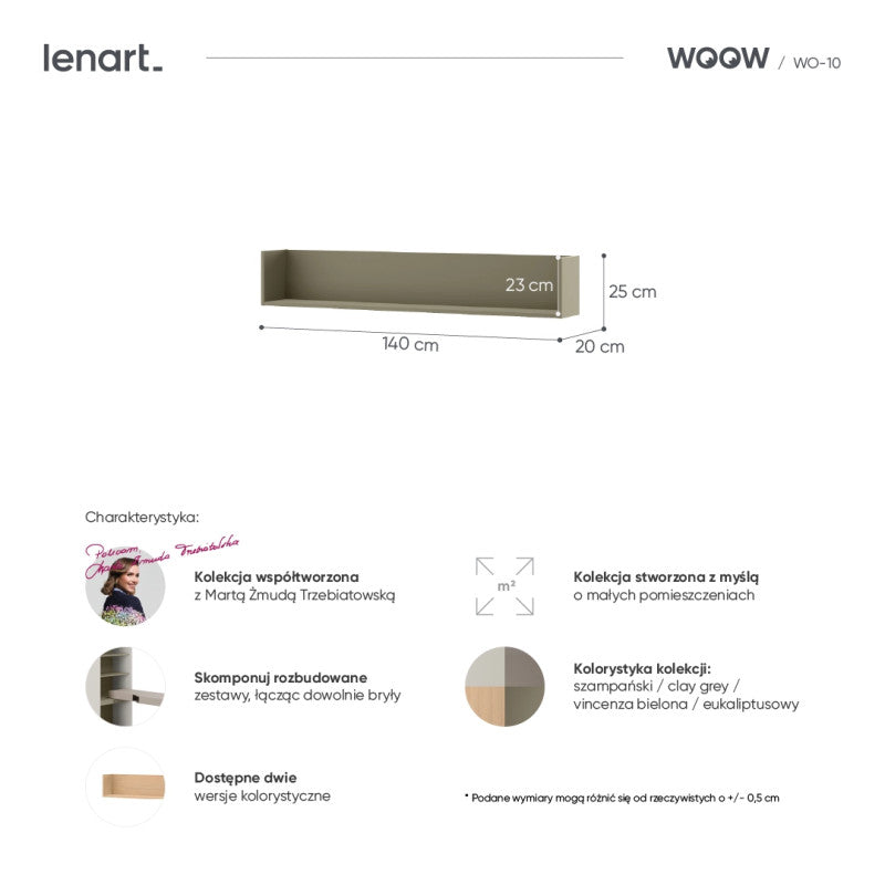 Wykonana z solidnych materiałów, gwarantuje trwałość i łatwość w utrzymaniu czystości. Półka WOOW łączy funkcjonalność z estetyką – idealna dla osób, które cenią nowoczesne i praktyczne rozwiązania w swoim wnętrzu.
