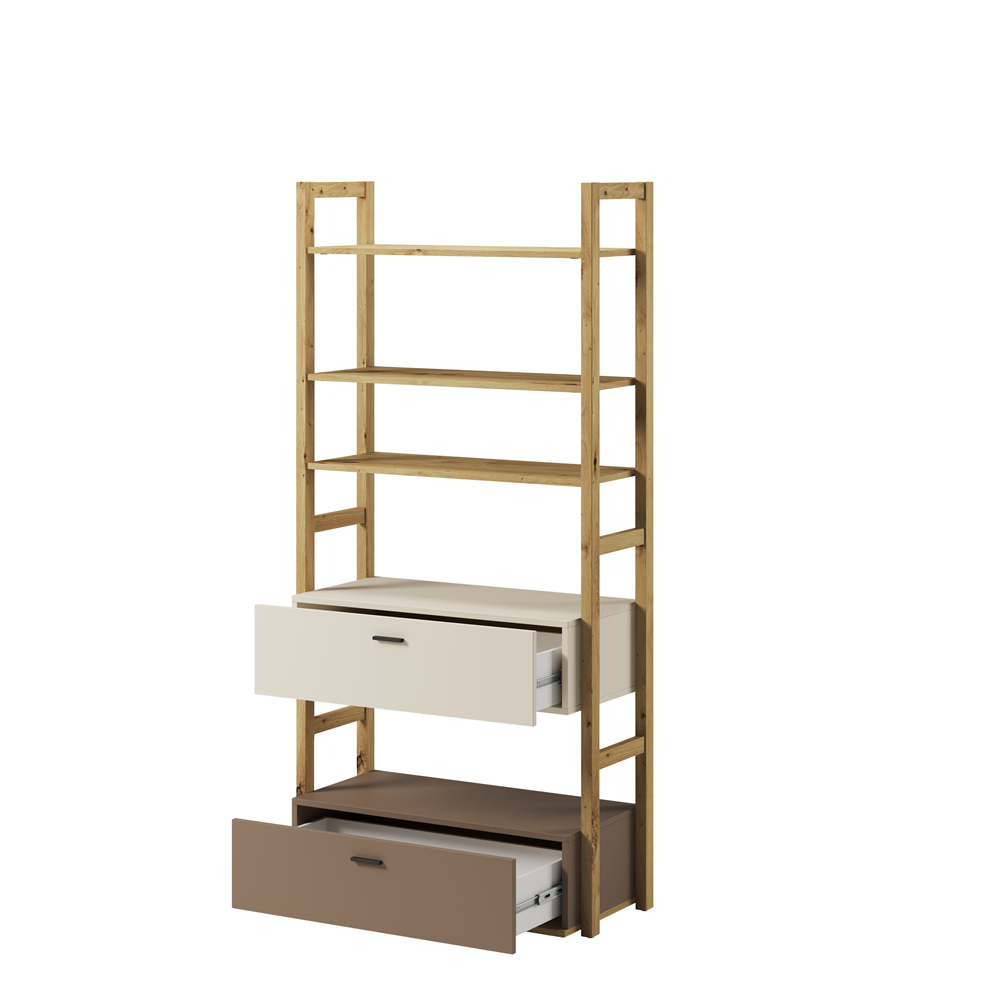 Regał posiada dwie praktyczne szuflady, z których jedna utrzymana jest w delikatnym beżowym odcieniu, a druga w modnym truflowym kolorze. To funkcjonalne rozwiązanie umożliwia segregację przechowywanych przedmiotów i dodaje regałowi indywidualnego charakteru.