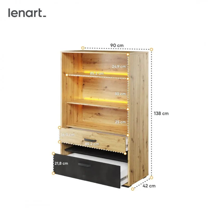 Dziecko to młody odkrywca, który lubi się wyróżniać? To oczywiste! Zatem pomysłem idealnym na urządzenie pokoju Twojej pociechy będzie kolekcja Qubic do pokoju młodzieżowego marki Lenart. Wysoki, dwukolorowy regał Qubic będzie odpowiednim miejscem na drobiazgi. Trzy półki pozwolą wyeksponować podręczniki, a także zdjęcia, zaś dwie szuflady ukryją przybory szkolne, odzież lub zabawki. O oryginalności regału świadczy między innymi ledowe oświetlenie, które dodatkowo ociepli wnętrze oraz wyeksponuje przedmioty znajdujące się na półkach. Dominujący kolor drewna został przełamany surowym odcieniem stali, dzięki czemu regał Qubic sprawdzi się zarówno w niewielkim pokoju, jak i w większym pomieszczeniu. Korpus regału został wykonany z płyty laminowanej, odpornej na uszkodzenia mechaniczne.