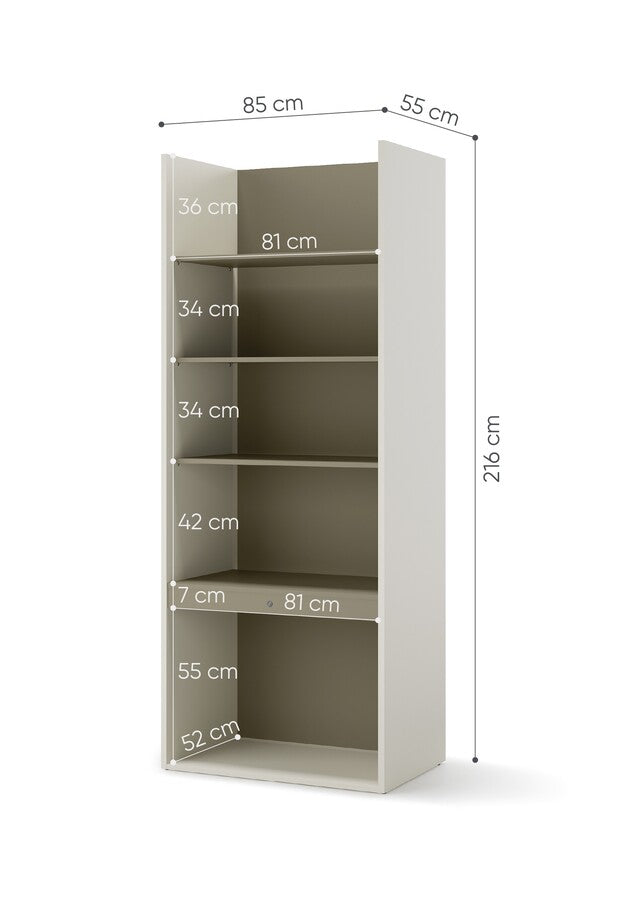 Regał wyposażony jest w kilka pojemnych półek, które pomieszczą książki, dekoracje, akcesoria i wiele innych drobiazgów. Otwarte przestrzenie pozwalają na łatwy dostęp do zawartości i dają możliwość indywidualnej aranżacji – od minimalistycznych ustawień po bardziej kreatywne kompozycje.