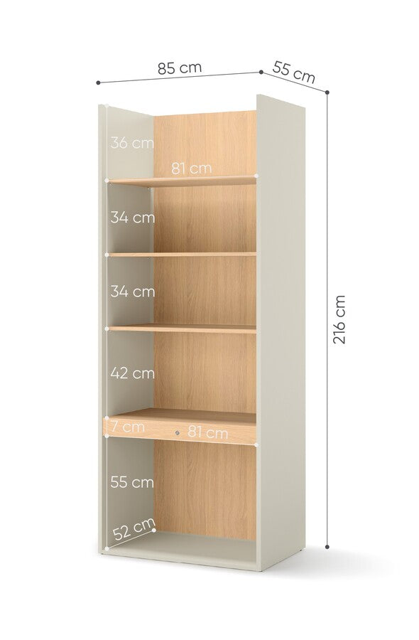 Regał wyposażony jest w kilka pojemnych półek, które pomieszczą książki, dekoracje, akcesoria i wiele innych drobiazgów. Otwarte przestrzenie pozwalają na łatwy dostęp do zawartości i dają możliwość indywidualnej aranżacji – od minimalistycznych ustawień po bardziej kreatywne kompozycje.