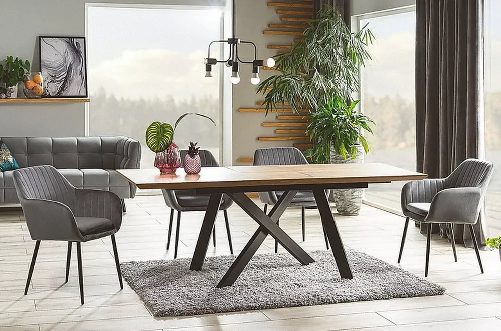 - Nowoczesny design: Połączenie dębowego blatu z czarnym metalowym stelażem w kształcie X nadaje stołowi elegancki i współczesny wygląd, który przyciąga wzrok.