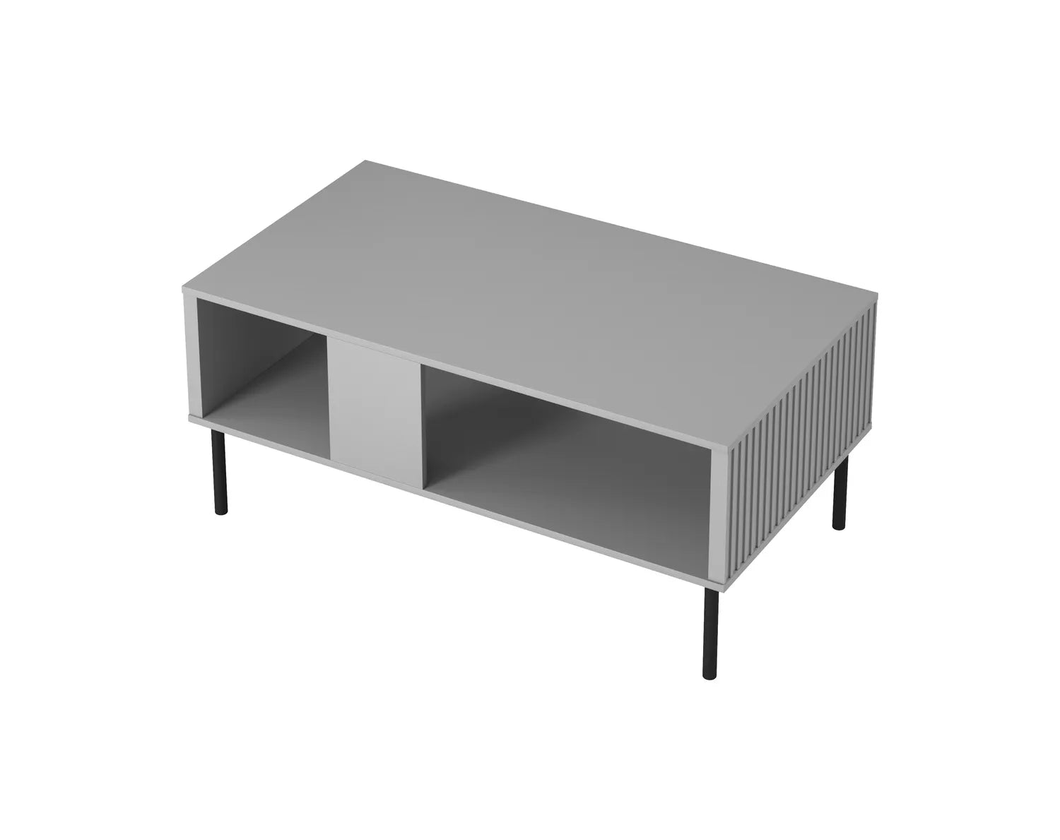 Stolik kawowy Asensio charakteryzuje się klasyczną formą prostopadłościanu, jednak dzięki ryflowanym dekorom zyskuje zupełnie nowy wymiar. Jego wymiary to 110 cm długości, 60 cm szerokości i 48 cm wysokości, co czyni go idealnym do różnorodnych przestrzeni. Wykonany z laminowanej płyty meblowej oraz MDF laminowanego, a jego metalowe nóżki zapewniają stabilność i trwałość.
