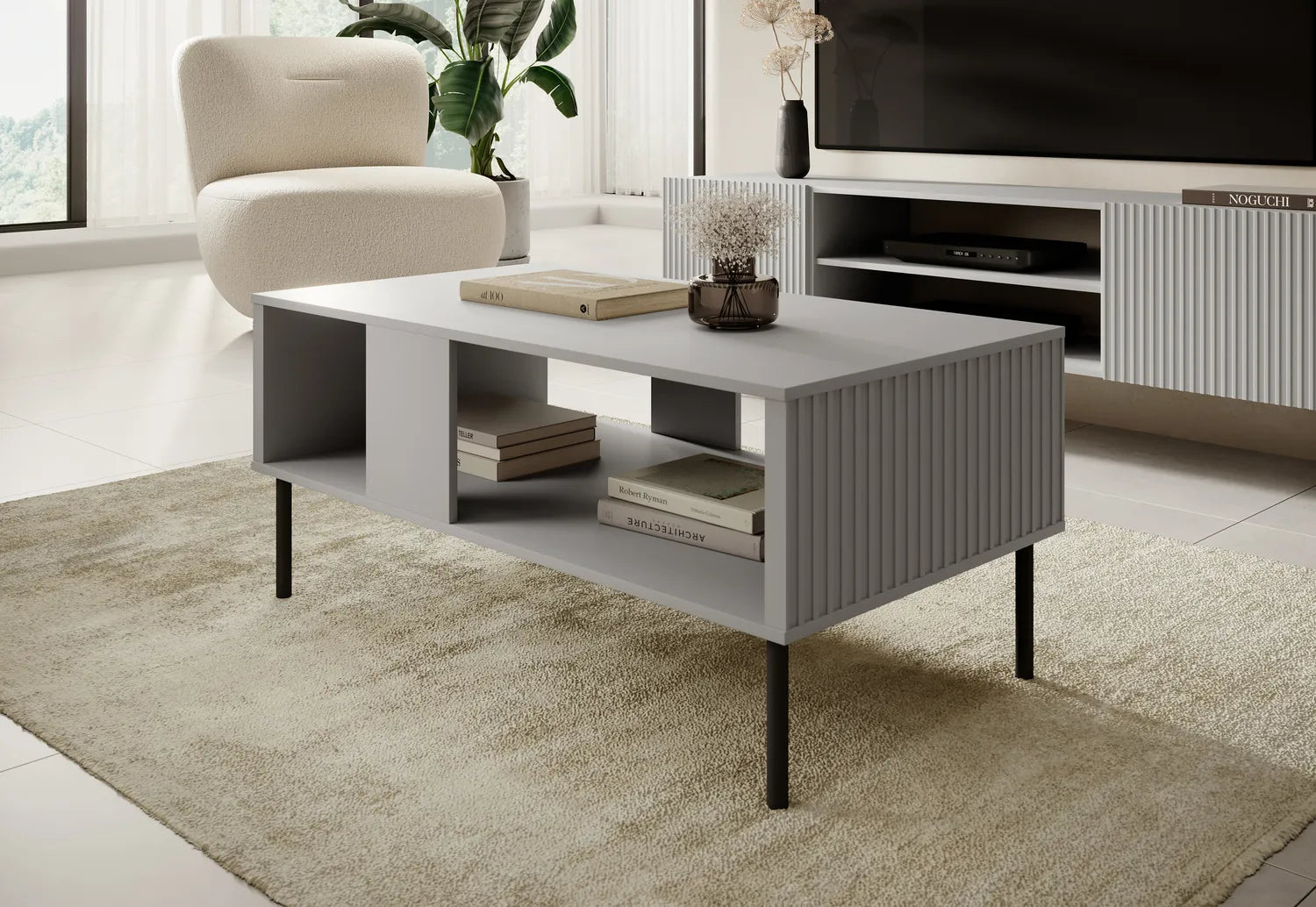 Jednym z głównych atutów stolika Asensio są modne ryflowane fronty, które nadają meblom wyjątkowego charakteru i oryginalnego wyglądu. Ryflowanie to popularny trend, który sprawia, że meble wyróżniają się na tle standardowych rozwiązań, dodając wnętrzu unikalności i elegancji.