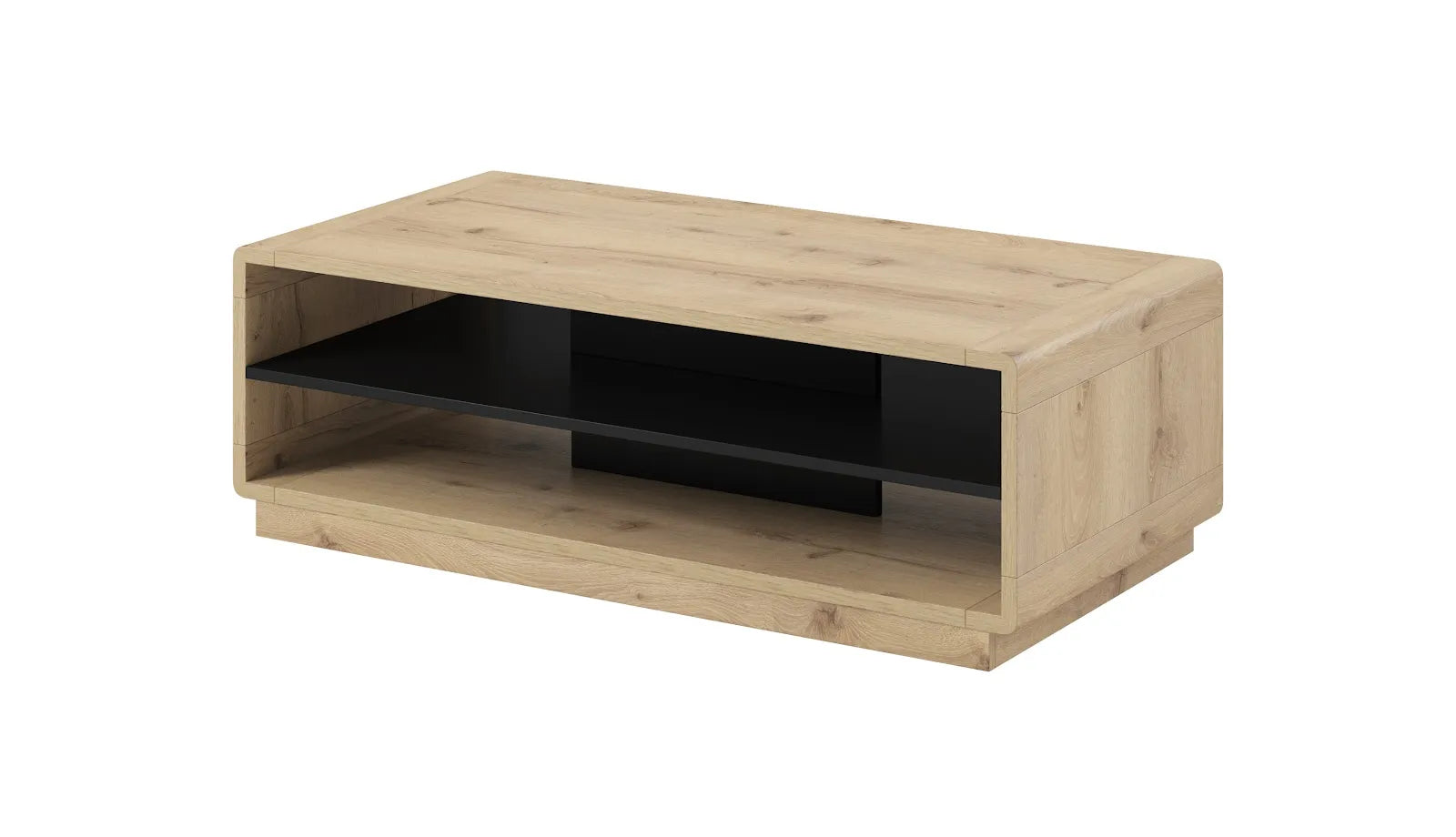 Zaokrąglone narożniki z MDF nadają stolikowi delikatności, tworząc jednocześnie bezpieczne dla użytkowników rozwiązanie. Krawędzie półek są oklejane z czterech stron, co podkreśla dbałość o detale i wykończenie mebla. Modne połączenie ciepłego dębu taurus z kontrastowym czarnym supermaciem sprawia, że stolik kawowy Aston stanie się eleganckim i funkcjonalnym elementem każdego nowoczesnego salonu.