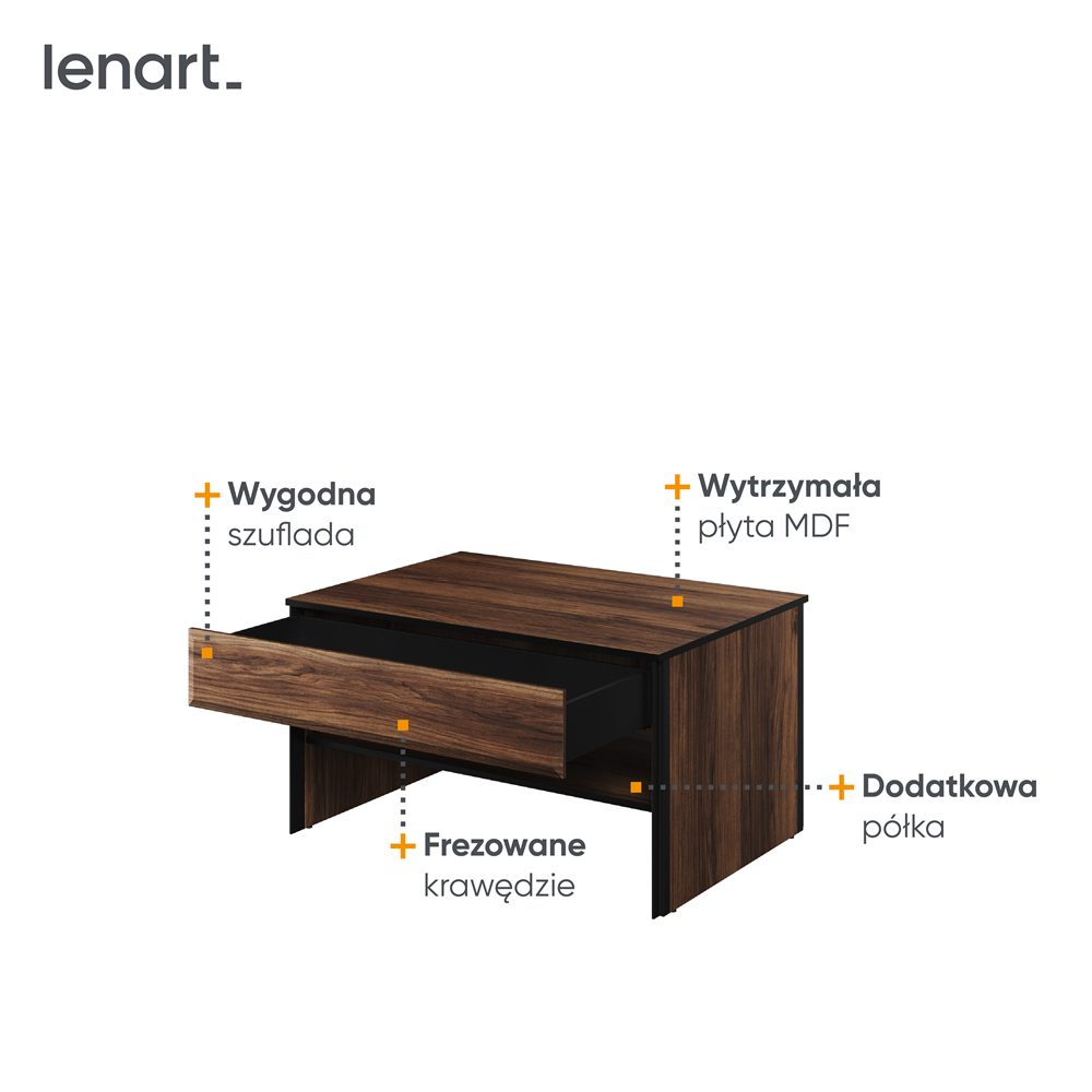 Jego główną cechą jest przemyślane zastosowanie szuflady, co stanowi doskonałe miejsce do przechowywania drobiazgów i innych przedmiotów, które można chować, aby utrzymać porządek w pomieszczeniu.