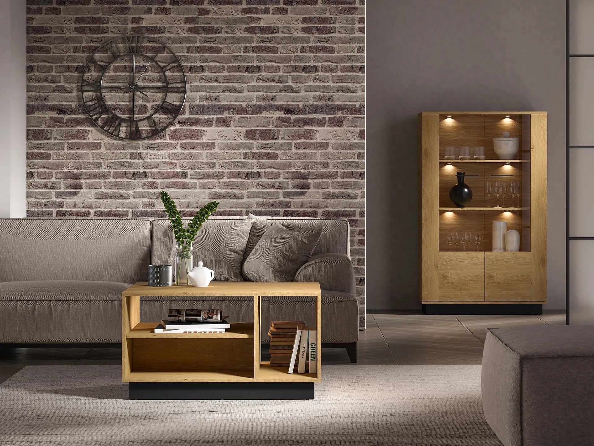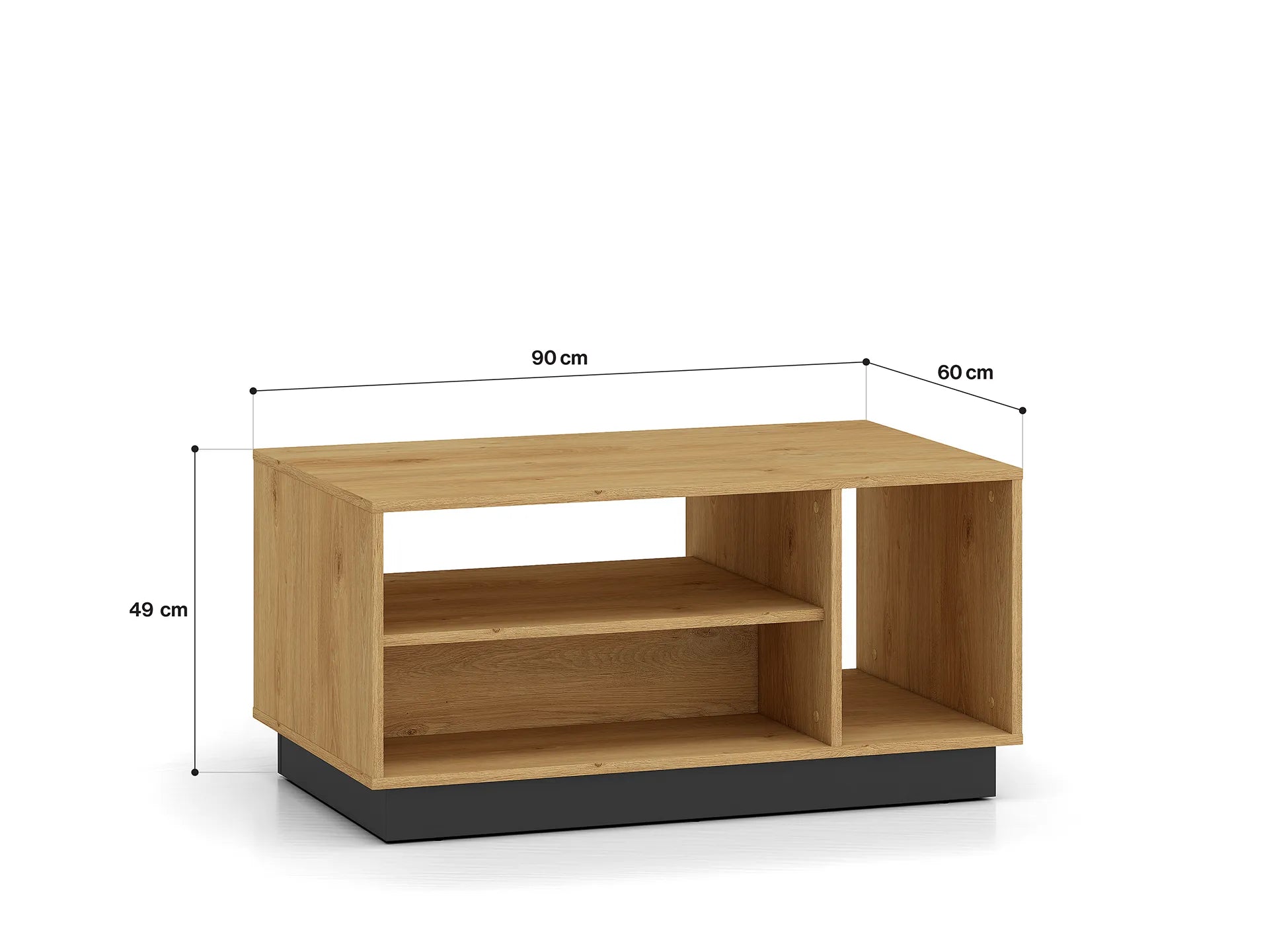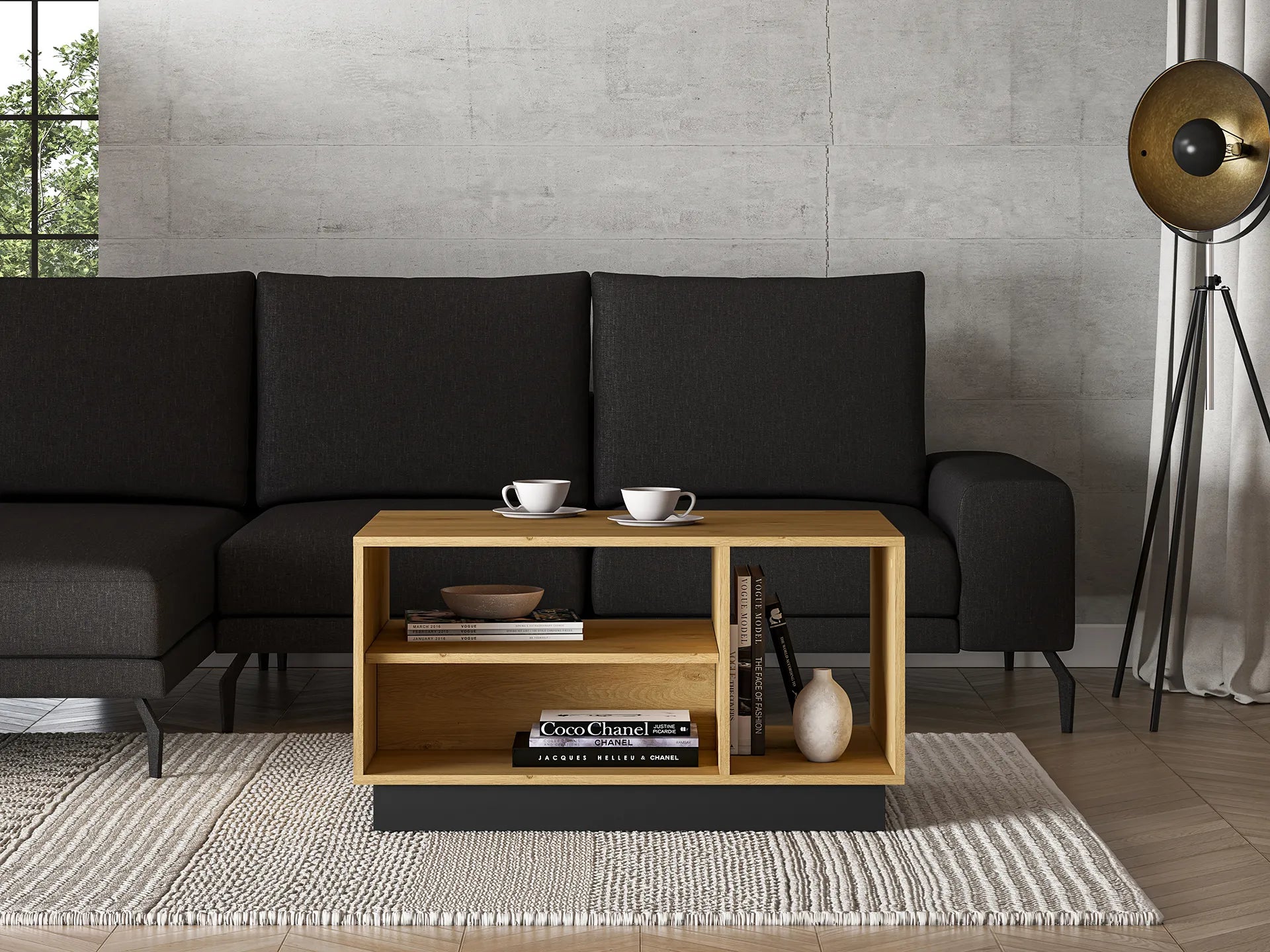 Stolik kawowy Modesto to idealne rozwiązanie dla osób ceniących nowoczesny design i funkcjonalność. Jego elegancka konstrukcja wyróżnia się praktycznymi, otwartymi półkami umieszczonymi centralnie, które doskonale sprawdzą się jako miejsce na drobiazgi, książki czy gadżety multimedialne. Dzięki temu, stolik pozwala na utrzymanie porządku w salonie, jednocześnie oferując łatwy dostęp do najpotrzebniejszych przedmiotów. Ława wykonana jest w stylowym kolorze dębu, który nadaje wnętrzu ciepły, naturalny charakter, a solidny cokół w czarnym odcieniu dodaje elegancji i stabilności. Stolik Modesto doskonale pasuje do nowoczesnych aranżacji wnętrz, łącząc estetykę z praktycznymi rozwiązaniami.