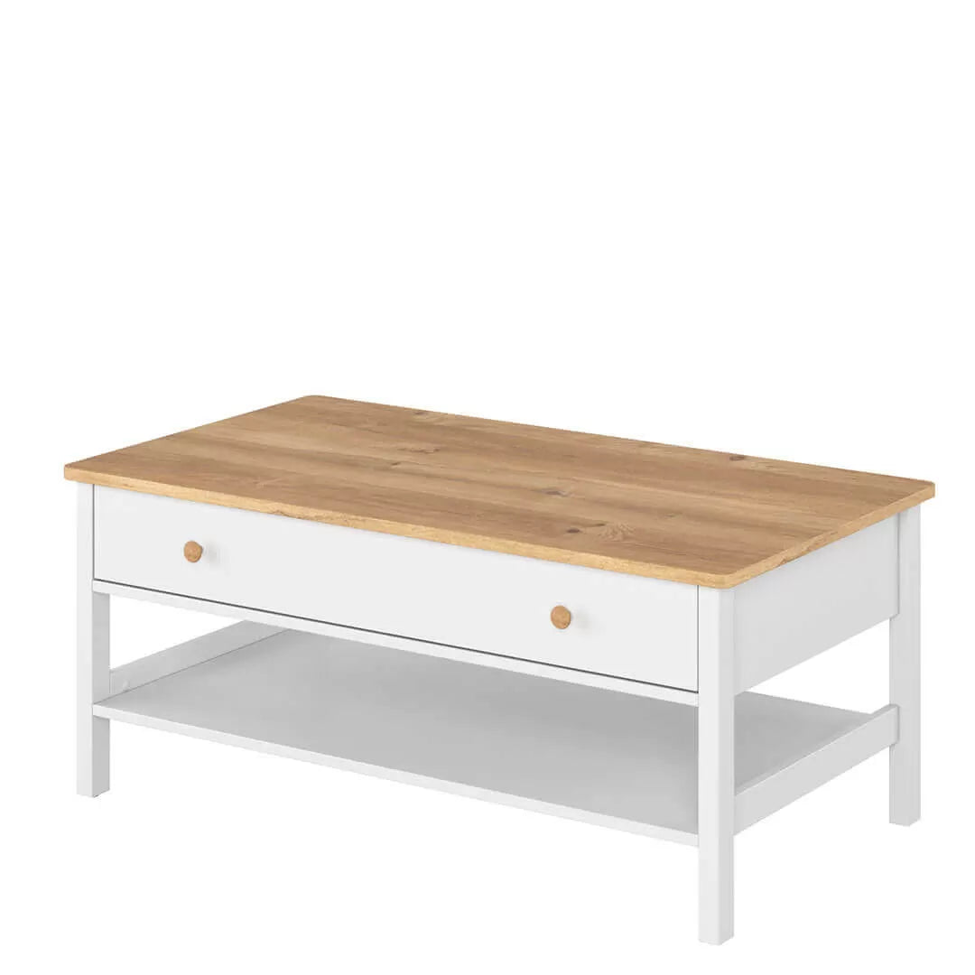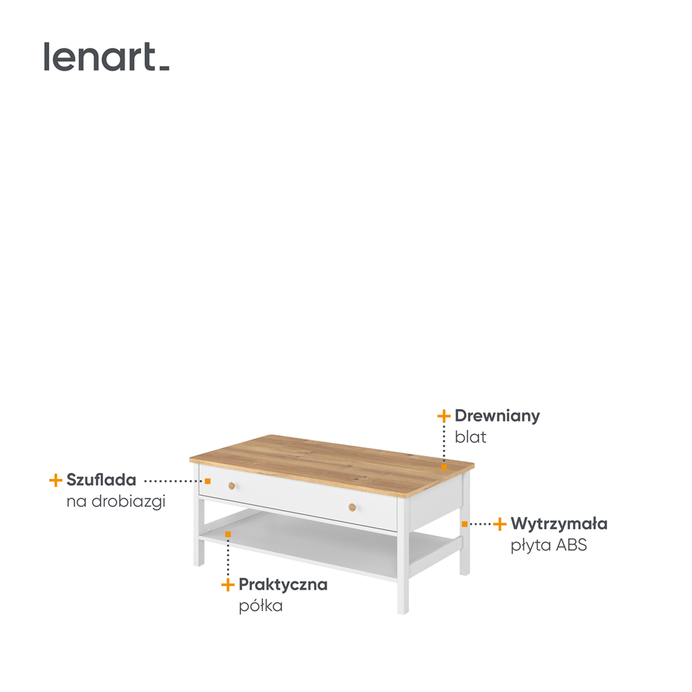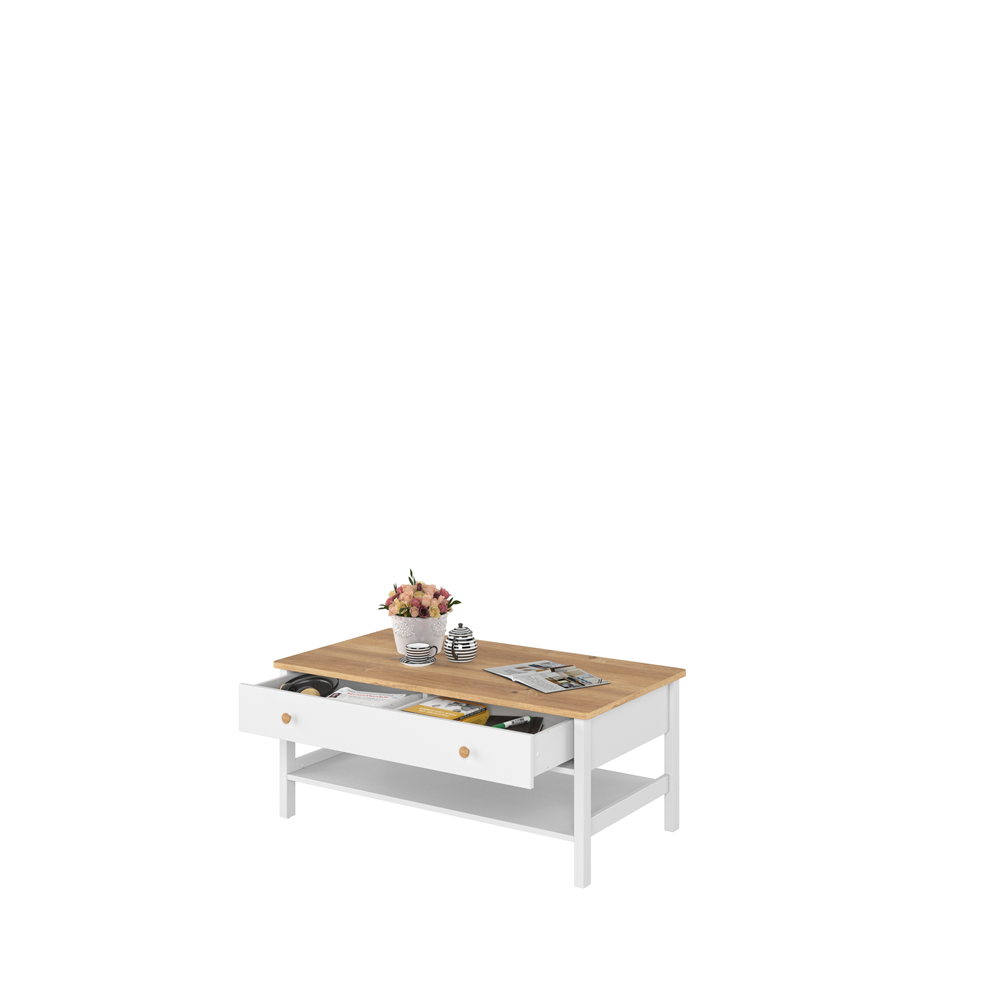 Delikatne zestawienie bieli i dekoru w jasnym odcieniu drewna nadaje temu stolikowi urok, który przypadnie do gustu miłośniczkom klasycznych aranżacji.