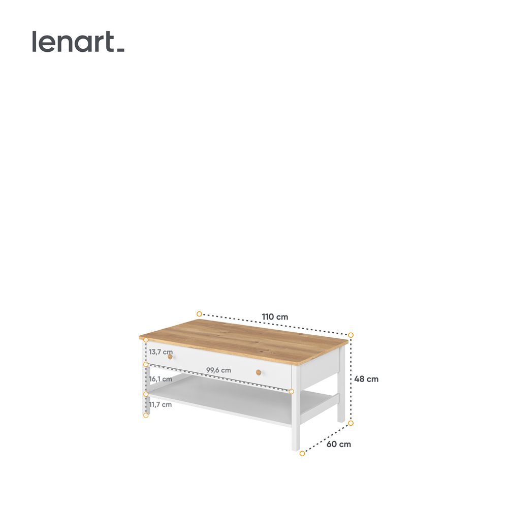 Mebel został wyprodukowany z wytrzymałej płyty laminowanej, wykończonej trwałym obrzeżem ABS. Uchwyty wykonane z tworzywa sztucznego.