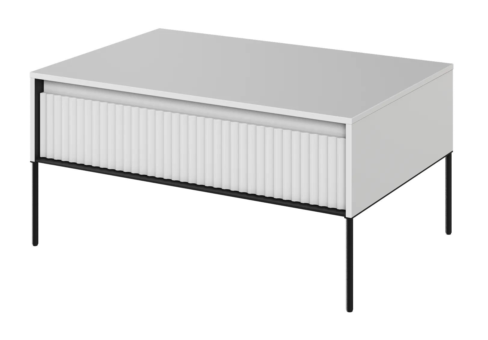 Front stolika kawowego Trend wykonany jest z MDF-u, a jego powierzchnia została frezowana. To efektowne wykończenie nadaje meblowi unikalny charakter i teksturę. Wyraźny frezowany wzór podkreśla dbałość o detale i nadaje meblowi pewnego rodzaju wyjątkowości.
