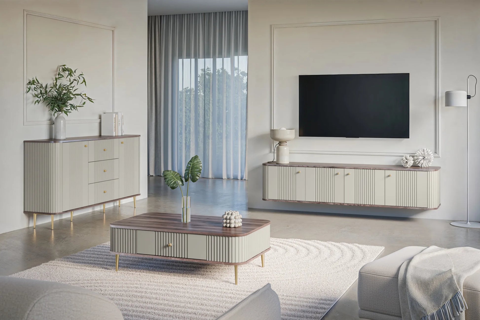 Stolik VESPER zachwyca swoim kaszmirowym korpusem i frontem, które w połączeniu ze złotymi nogami i uchwytami tworzą spójną, elegancką kompozycję. To mebel, który doda każdemu salonowi wyrafinowanego charakteru, a ryflowany front szuflady dodaje mu oryginalności i stylu.