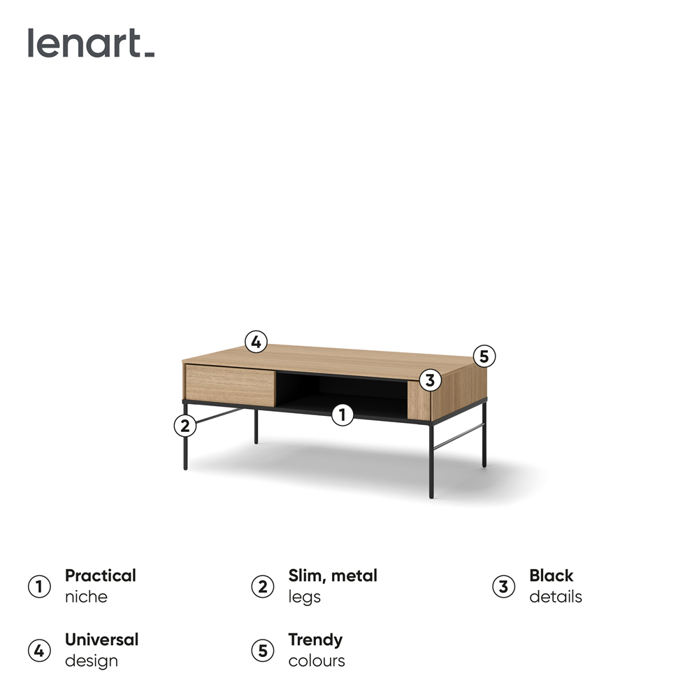 Nasz stolik do pokoju zachwyca prostotą i elegancją. Doskonale wpisuje się w modne aranżacje w stylu skandynawskim, industrialnym, minimalistycznym czy klasycznym. Subtelna forma i estetyczne wykończenie sprawiają, że stolik świetnie komponuje się zarówno z jasnymi, jak i ciemnymi wnętrzami, dodając im lekkości i nowoczesnego charakteru.