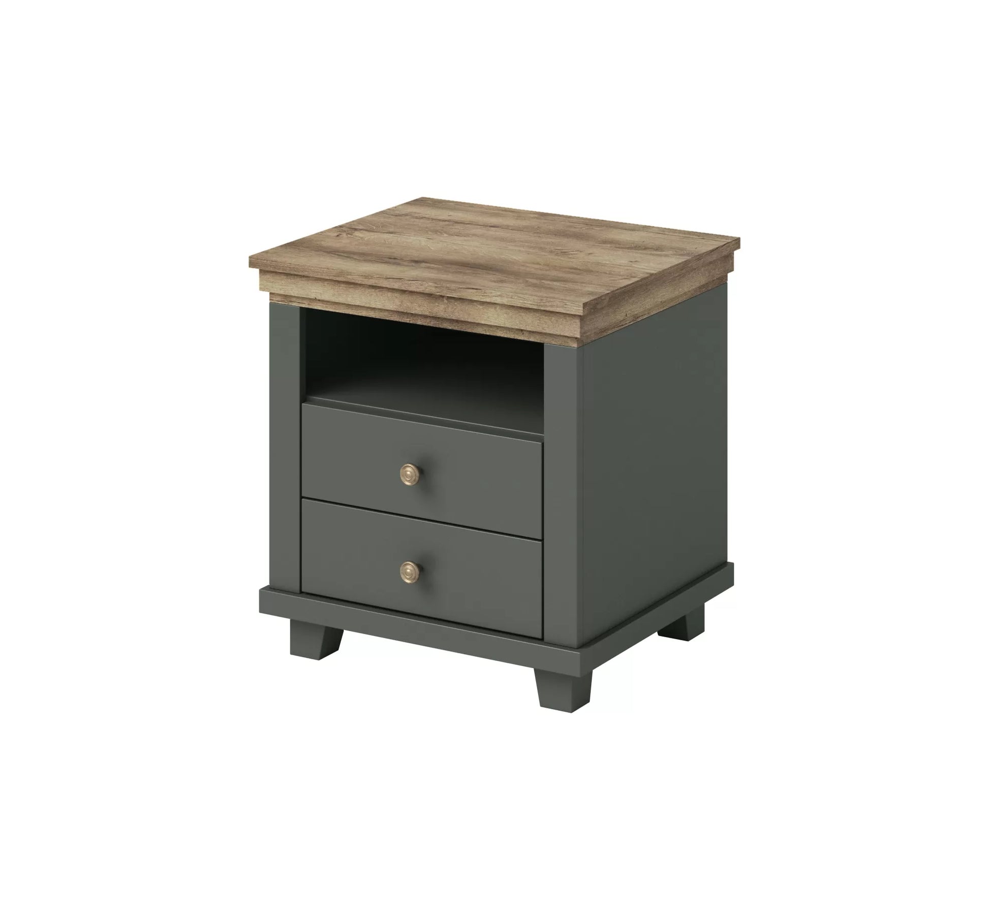Kolorystyka stolika nocnego Evora to piękne połączenie zielonego koloru z detalami w dębie lefkas. Ten nietuzinkowy kolor nadaje stolikowi nocnemu wyjątkowego charakteru, nadając pomieszczeniu świeżości i oryginalności.
