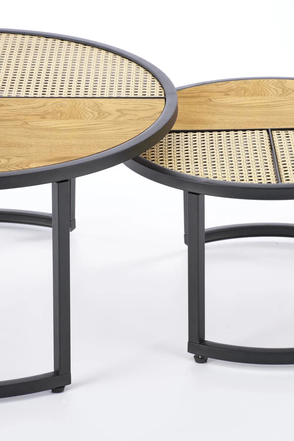 Połączenie MDF okleinowanego z rattanem syntetycznym i stalą malowaną proszkowo gwarantuje trwałość i solidność mebli, jednocześnie nadając im elegancki wygląd. Kolorystyka w odcieniach dębu złotego i czerni sprawia, że zestaw ten doskonale komponuje się z różnorodnymi stylami wnętrzarskimi, od nowoczesnych po klasyczne.