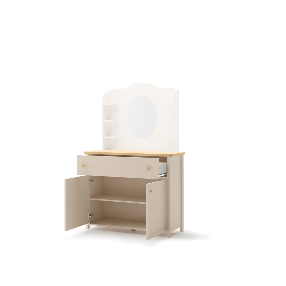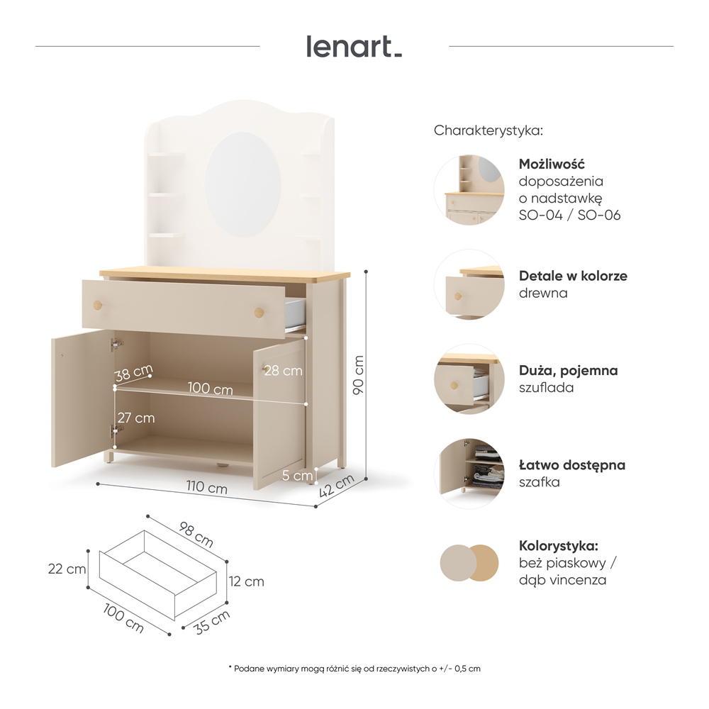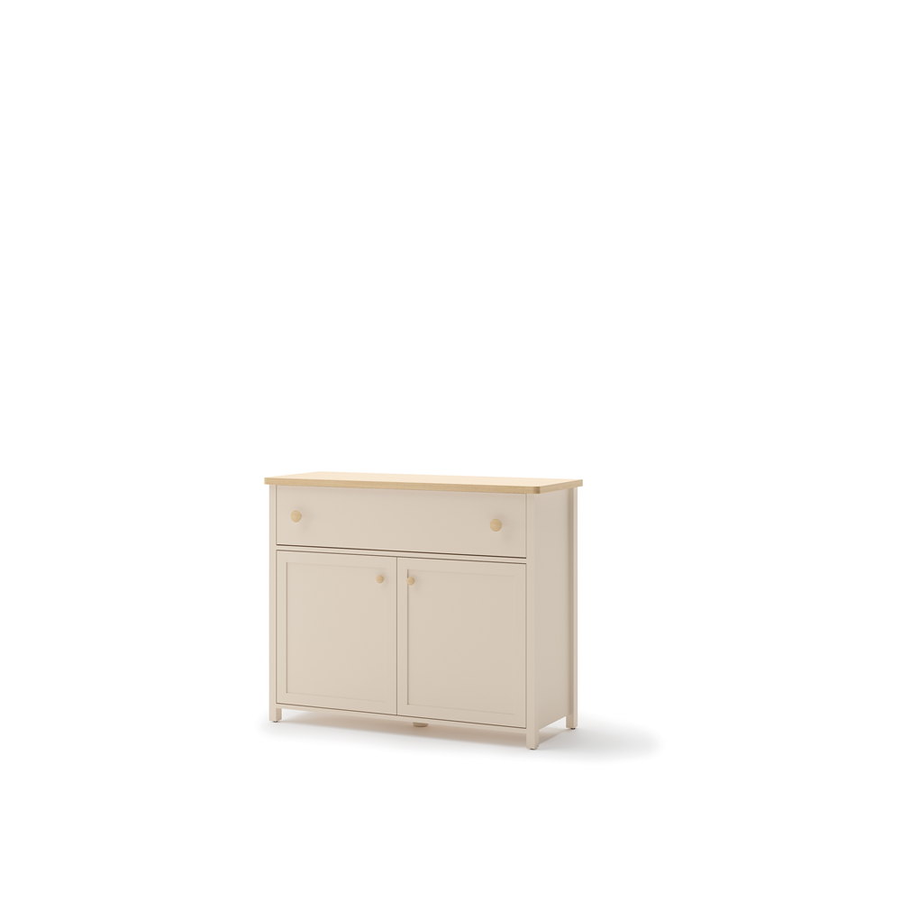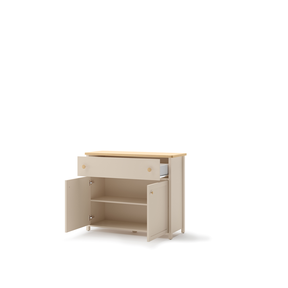 Pojemna dwudrzwiowa komoda z szufladą pomieści codzienną garderobę. Mebel wykonano z wytrzymałej płyty laminowanej wykończonej trwałym obrzeżem ABS. Uchwyty z tworzywa. Do skompletowania z nadstawką z lustrem SO-06. |
