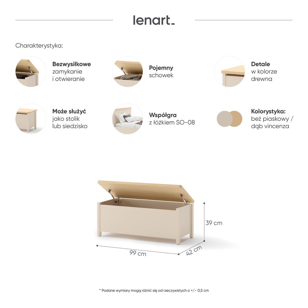 | Wielofunkcyjna skrzynia pomieści pościel lub drobiazgi, może też posłużyć jako stolik albo siedzisko. Dzięki podnośnikowi gazowemu można ją łatwo otworzyć i zamknąć. Mebel wykonano z wytrzymałej płyty laminowanej wykończonej trwałym obrzeżem ABS. |