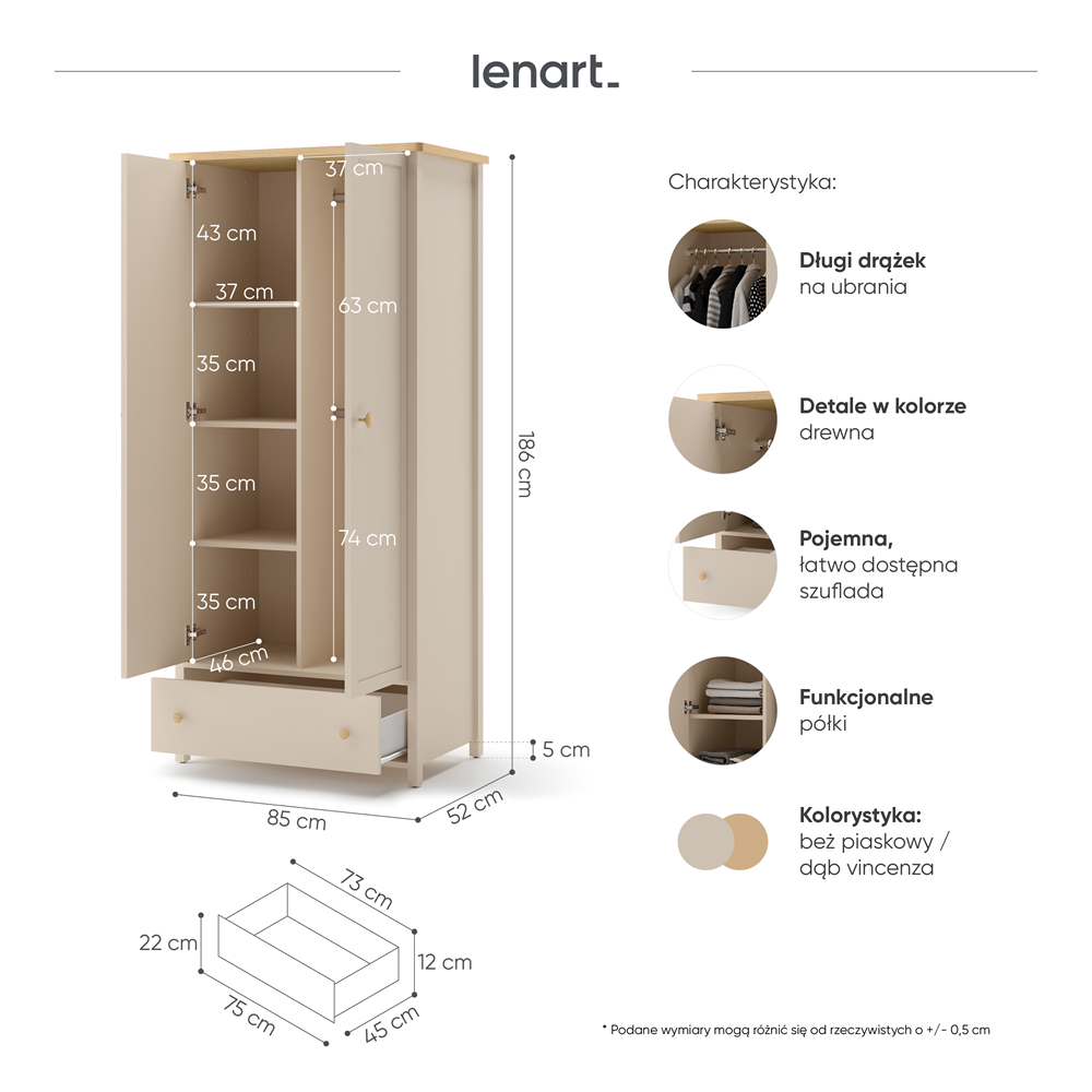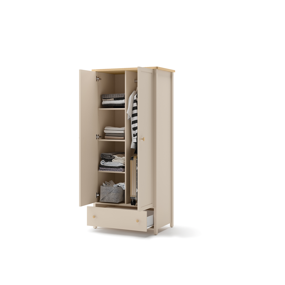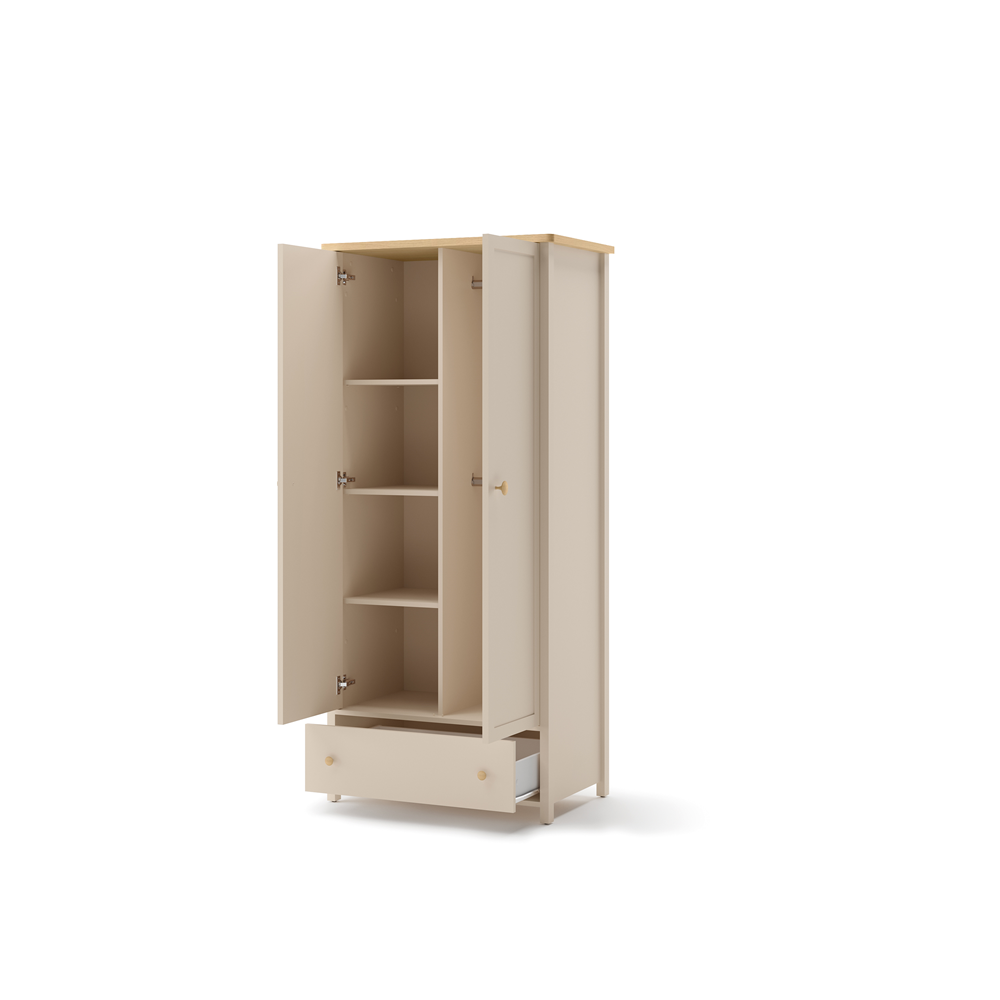 | Dwudrzwiowa szafa na ubrania z dwoma drążkami, regałem z półkami i pojemną łatwodostępną szufladą. Dzięki takiej konstrukcji maksymalnie wykorzystujemy wnętrze szafy. Możemy w niej zawiesić ubrania różnej długości oraz przechować złożone tekstylia. Mebel wykonano z wytrzymałej płyty laminowanej wykończonej trwałym obrzeżem ABS. Uchwyty z tworzywa. |