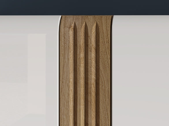 Prosta, uporządkowana bryła z pionowym podziałem frontu doskonale wpisuje się w nowoczesne aranżacje. Pełne fronty skutecznie ukrywają zawartość, dbając o wizualny ład w salonie. Subtelne, relingowe uchwyty nadają całości eleganckiego charakteru i zapewniają wygodny, pewny chwyt.