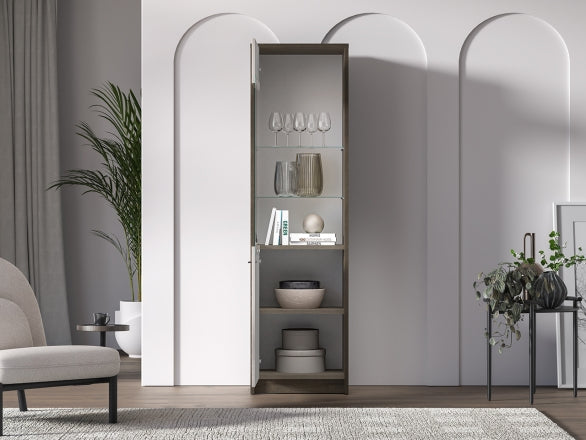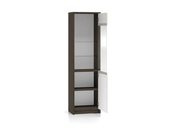 Wnętrze zostało wyposażone w 4 praktyczne półki, które umożliwiają wygodne rozdzielenie szkła, porcelany, książek czy dokumentów. Górna, przeszklona część doskonale nadaje się do prezentacji wybranych przedmiotów, natomiast dolna, zabudowana strefa pozwala przechowywać rzeczy, które warto mieć pod ręką, ale poza zasięgiem wzroku i kurzu.