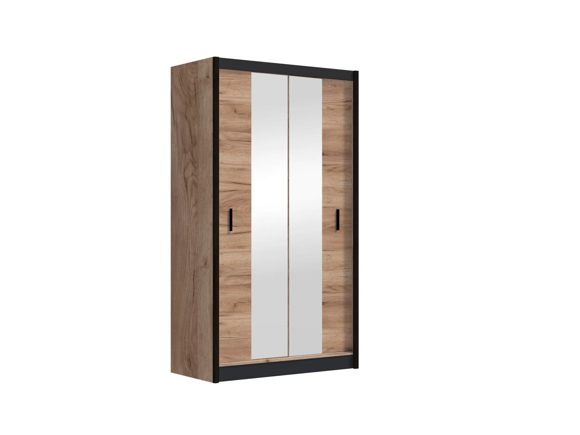 Uchwyty szafy wykonane są z tworzywa sztucznego w kolorze czarnym, co harmonijnie współgra z wykończeniem bocznym i nadaje całości spójny wygląd.