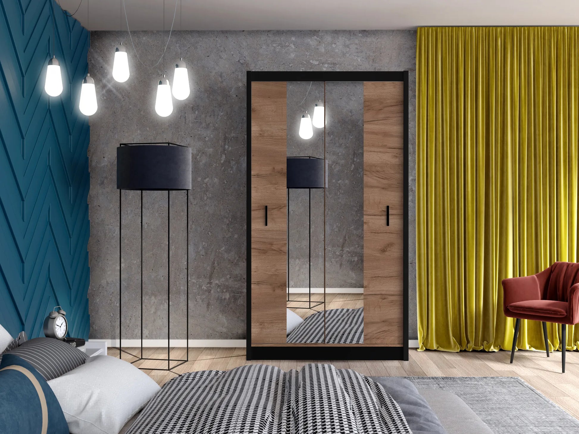 Front szafy został ozdobiony dużymi lustrami, które nie tylko dodają przestrzeni i światła, ale także stanowią wyjątkowy element dekoracyjny, który optycznie powiększa pomieszczenie.